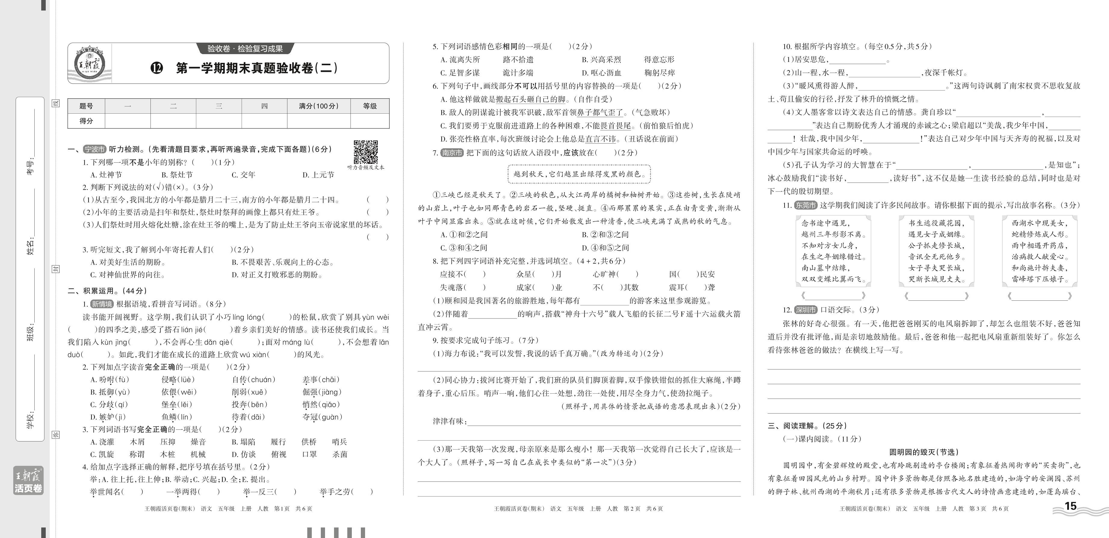 2023上册五年级语文人教版 12 第一学期期末真题验收卷(二)