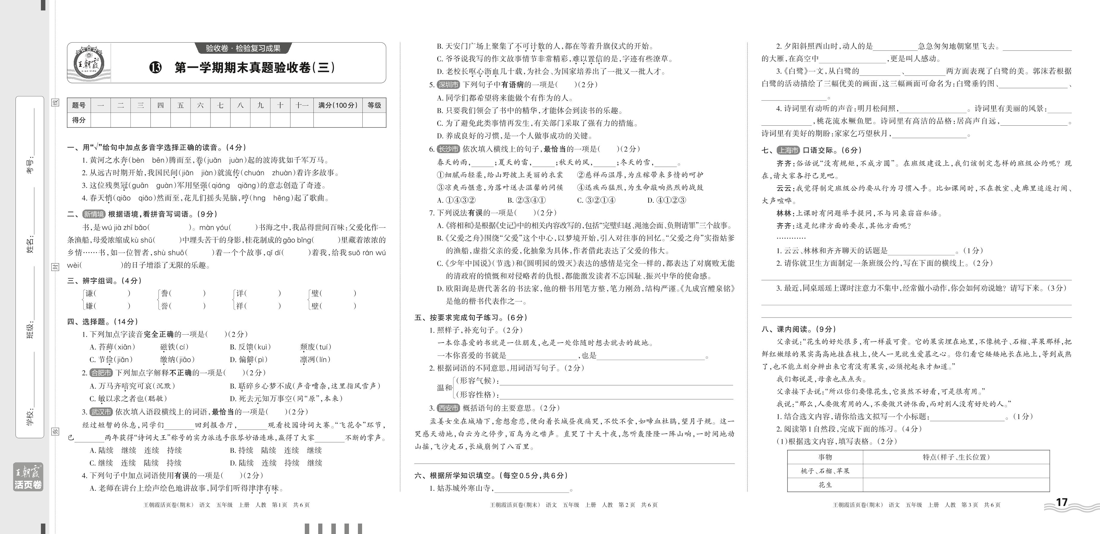 2023上册五年级语文人教版 13 第一学期期末真题验收卷(三)