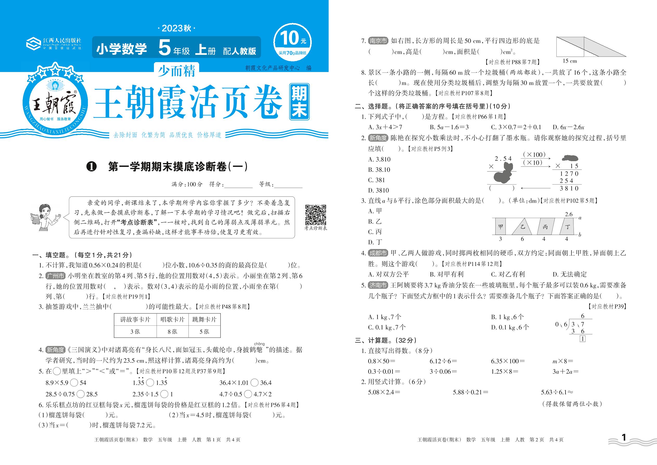 2023上册五年级数学人教版 1 第一学期期末摸底诊断卷(一)