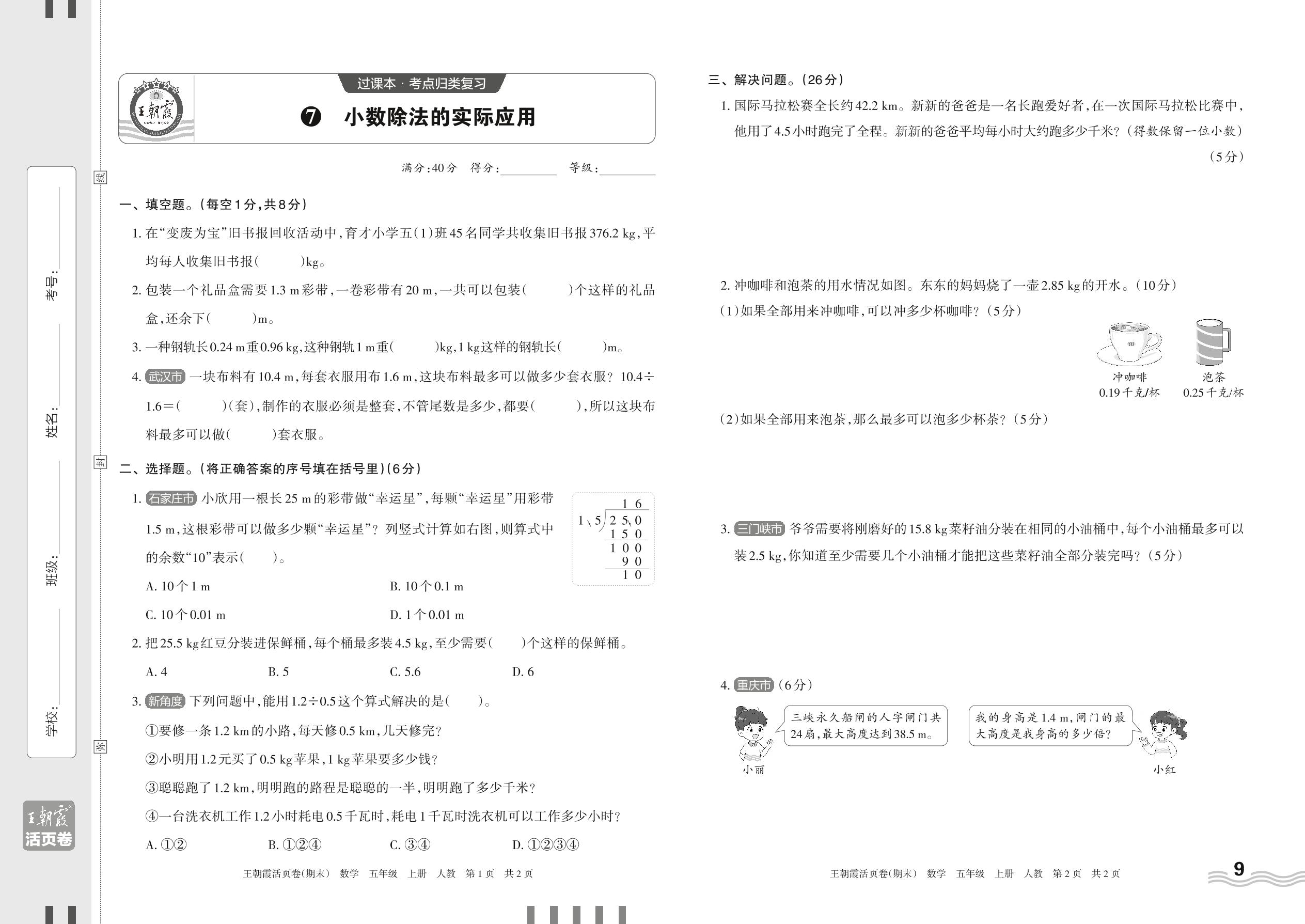 2023上册五年级数学人教版 7 小数除法的实际应用