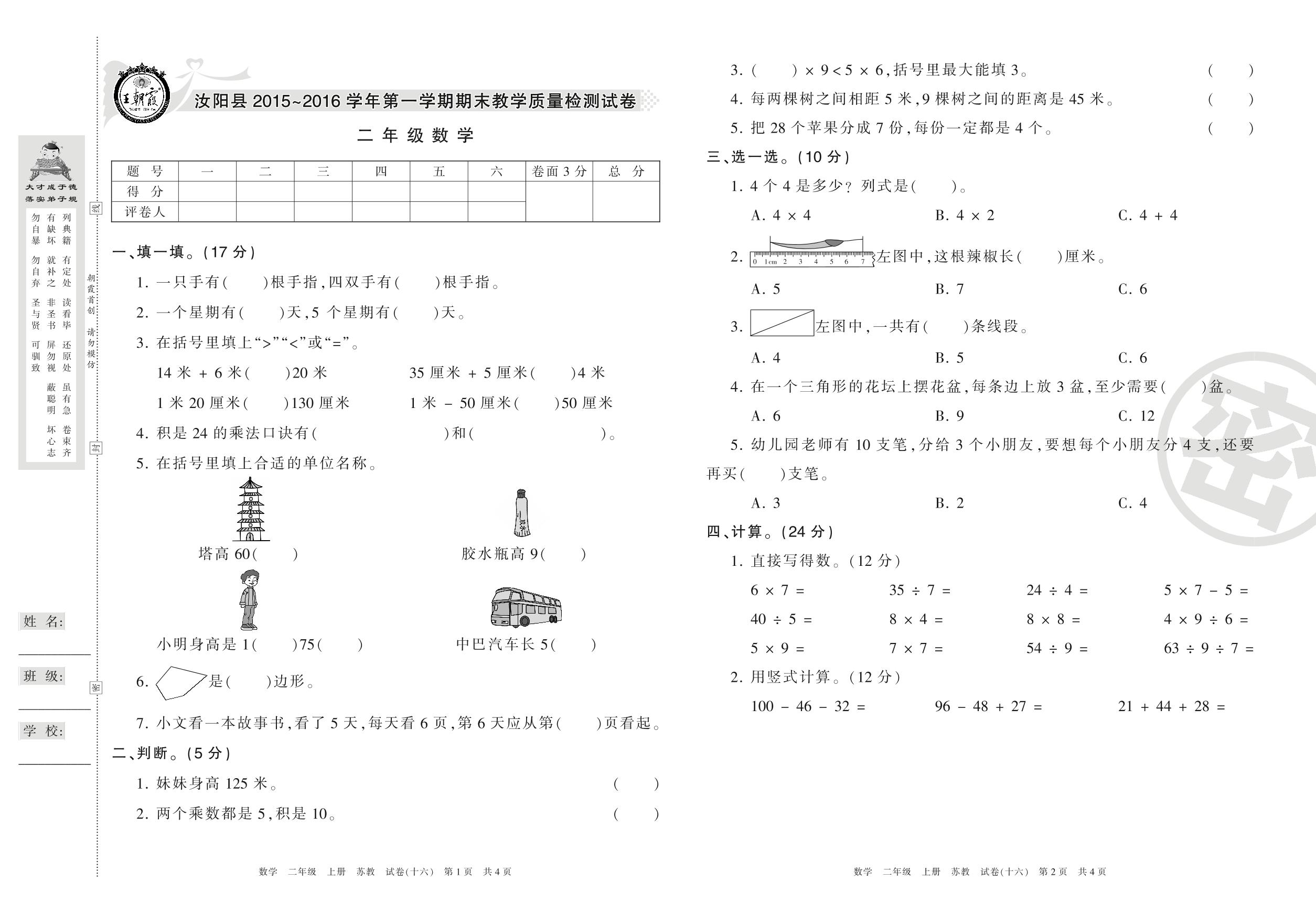 2015-2016学年第一学期洛阳市汝阳县二年级数学试卷(苏教版)【16】