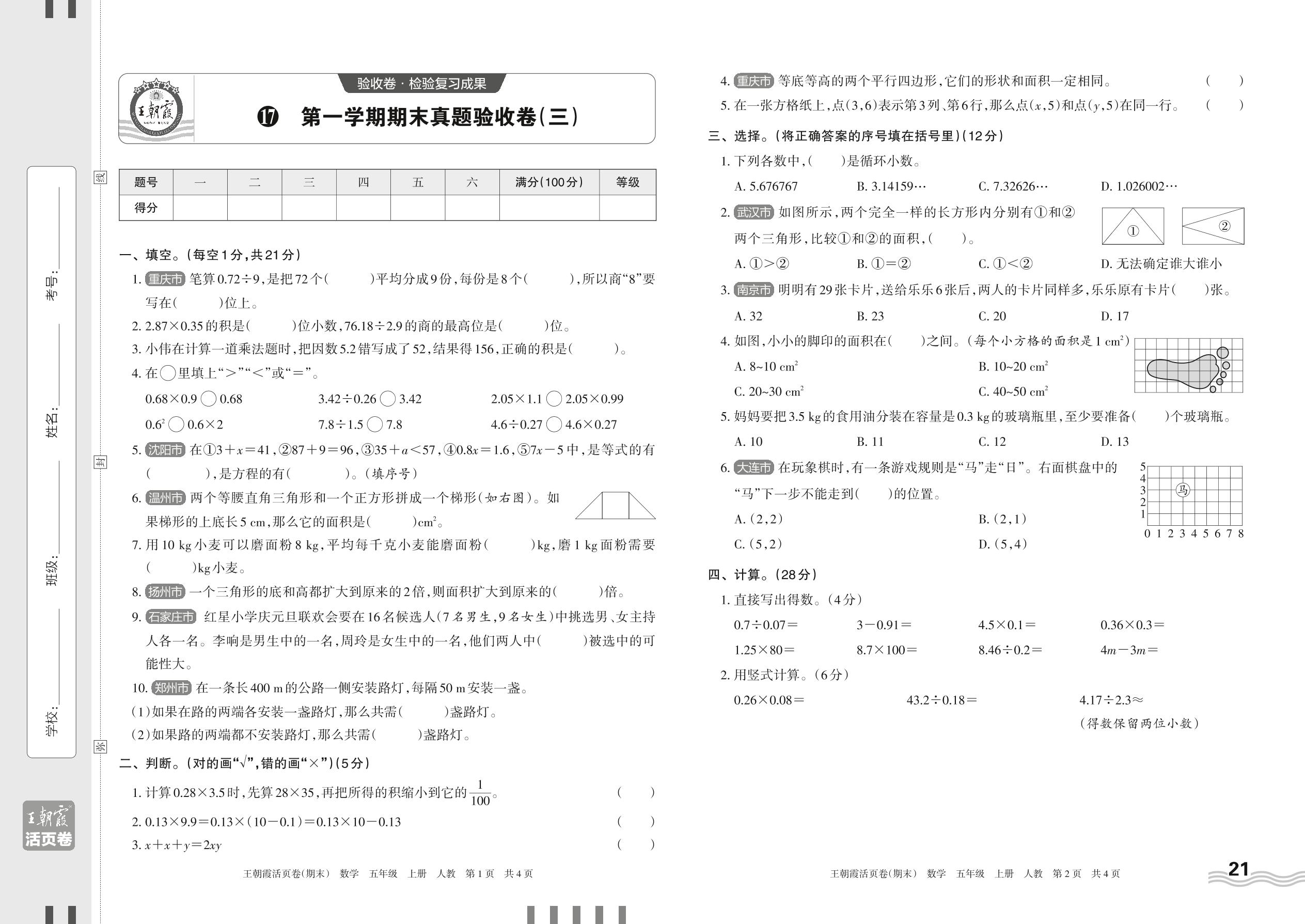 2023上册五年级数学人教版 17 第一学期期末真题验收卷(三)