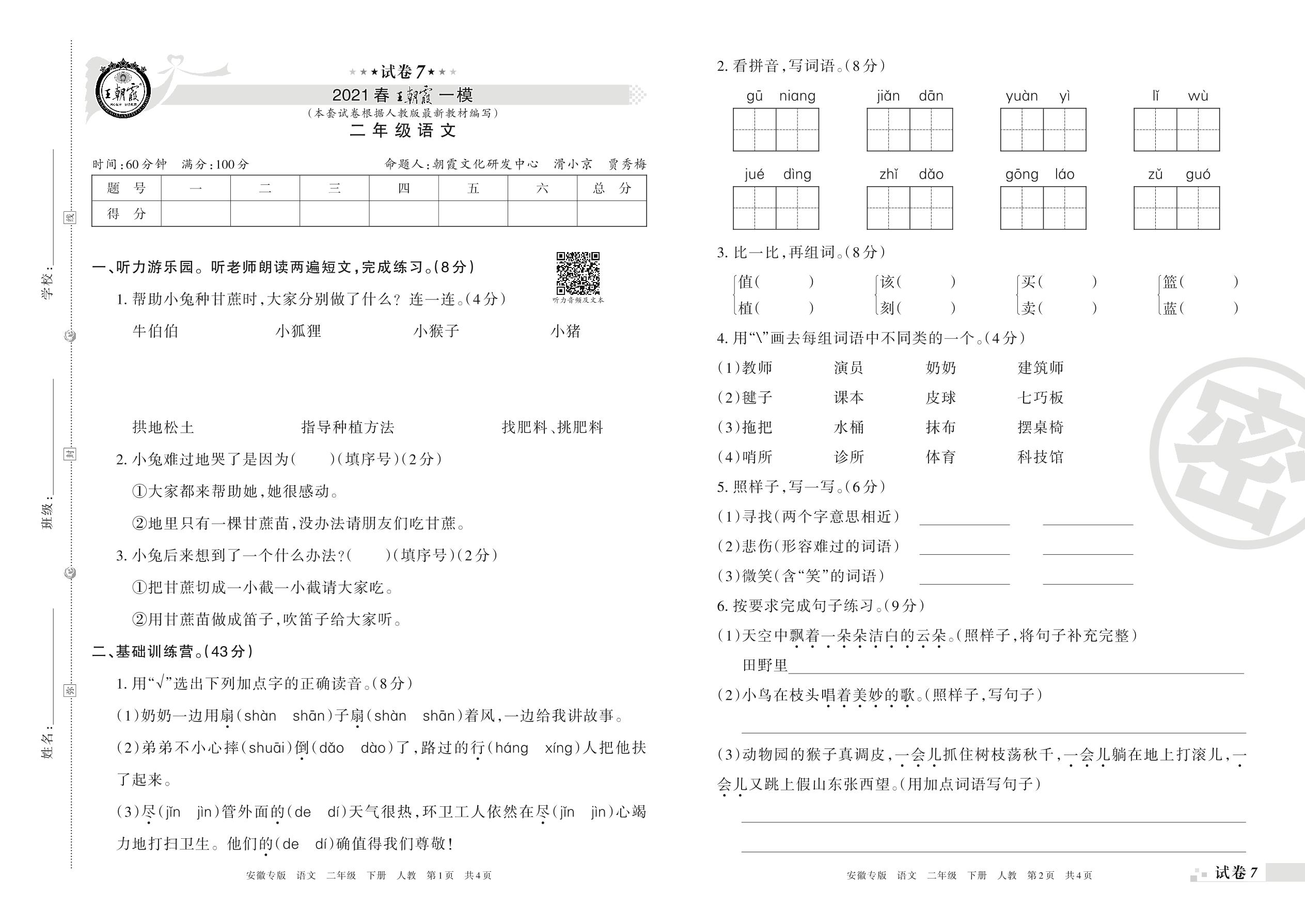 王朝霞期末模拟卷二年级下册语文(人教版)_R21080163543【7】