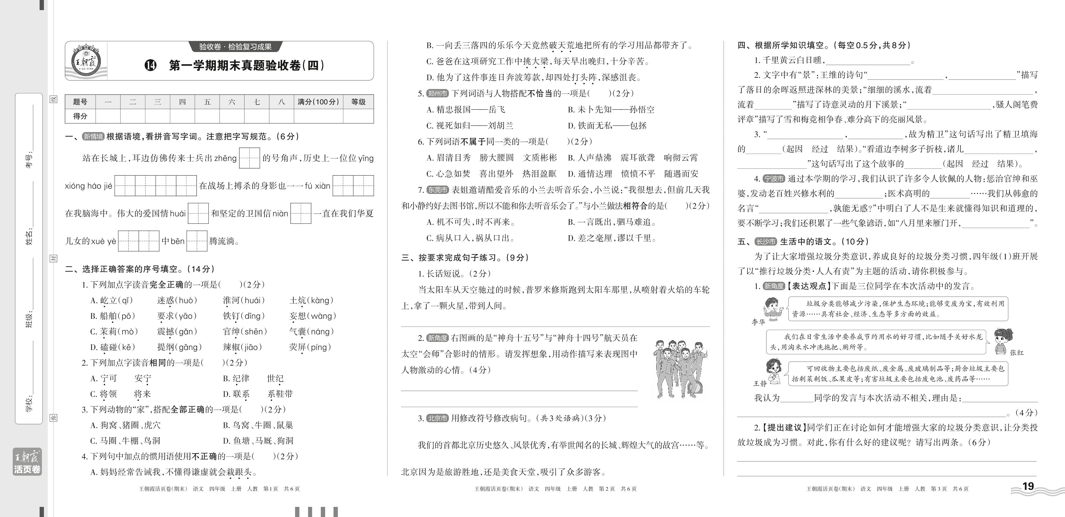 2023上册四年级语文人教版 14 第一学期期末真题验收卷(四)