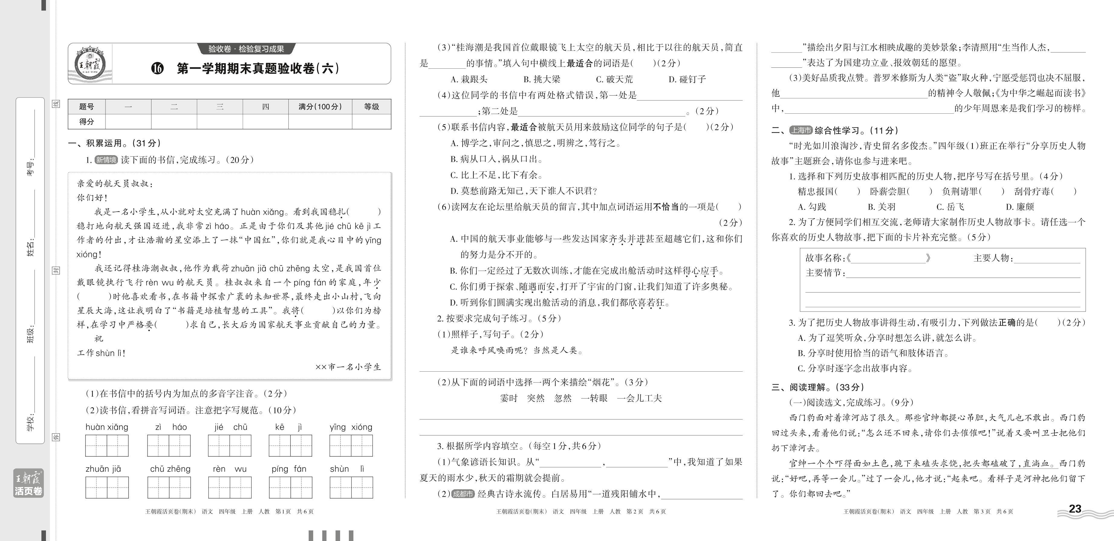 2023上册四年级语文人教版 16 第一学期期末真题验收卷(六)