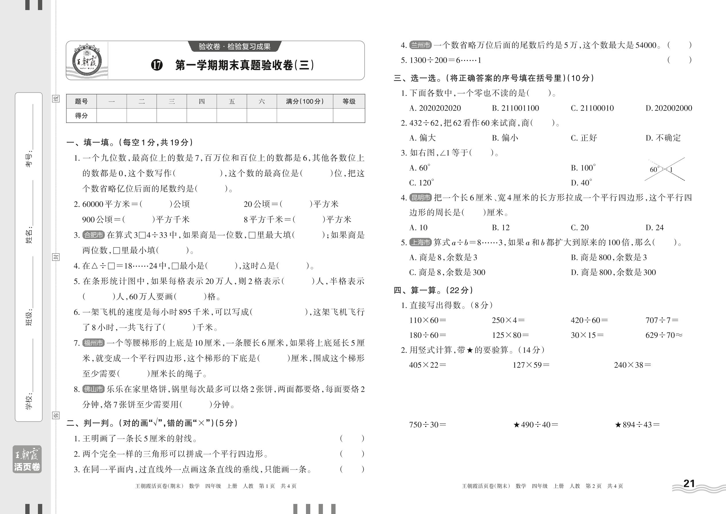 2023上册四年级数学人教版 17 第一学期期末真题验收卷(三)