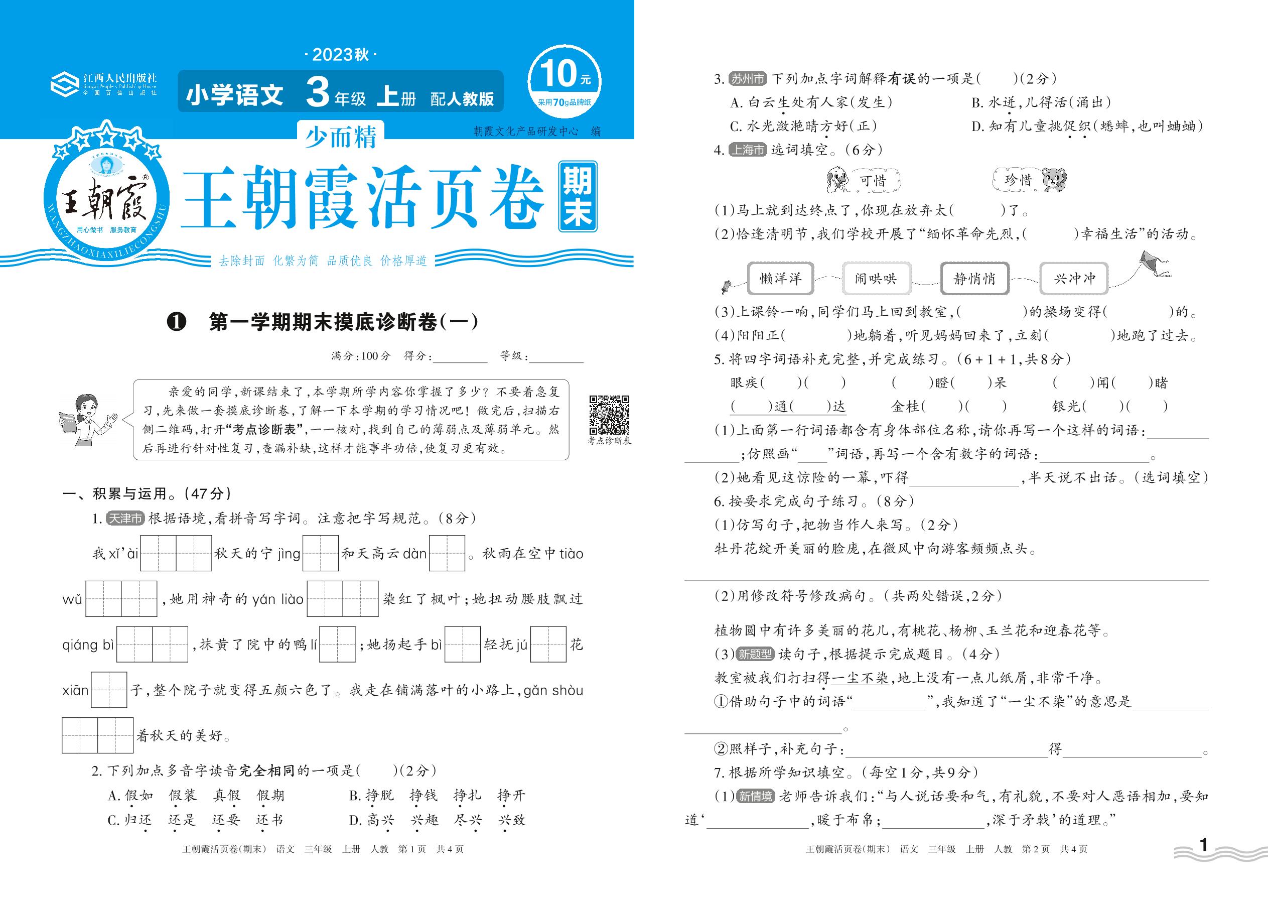 2023上册三年级语文人教版 1 第一学期期末摸底诊断卷(一)