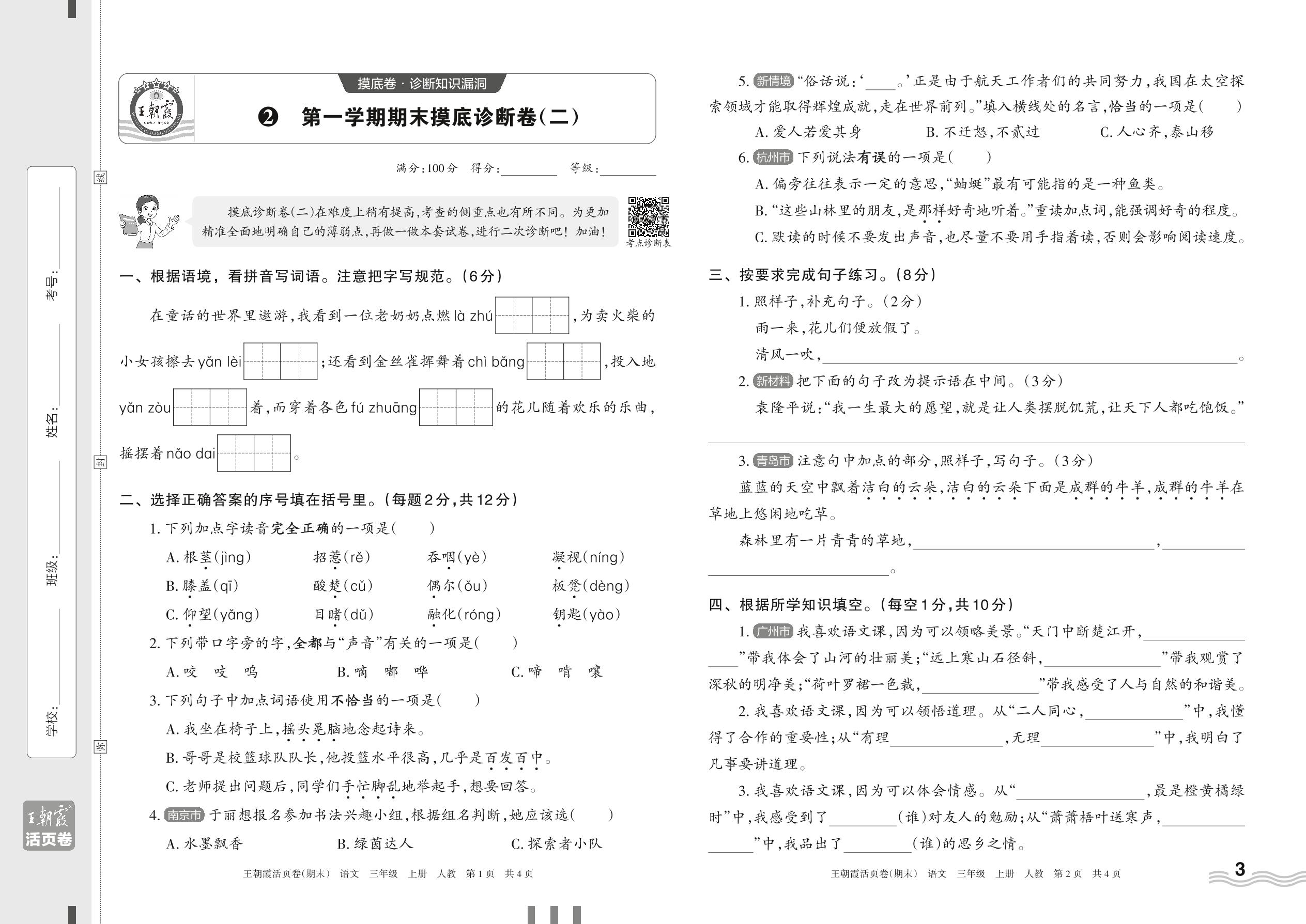 2023上册三年级语文人教版 2 第一学期期末摸底诊断卷(二)