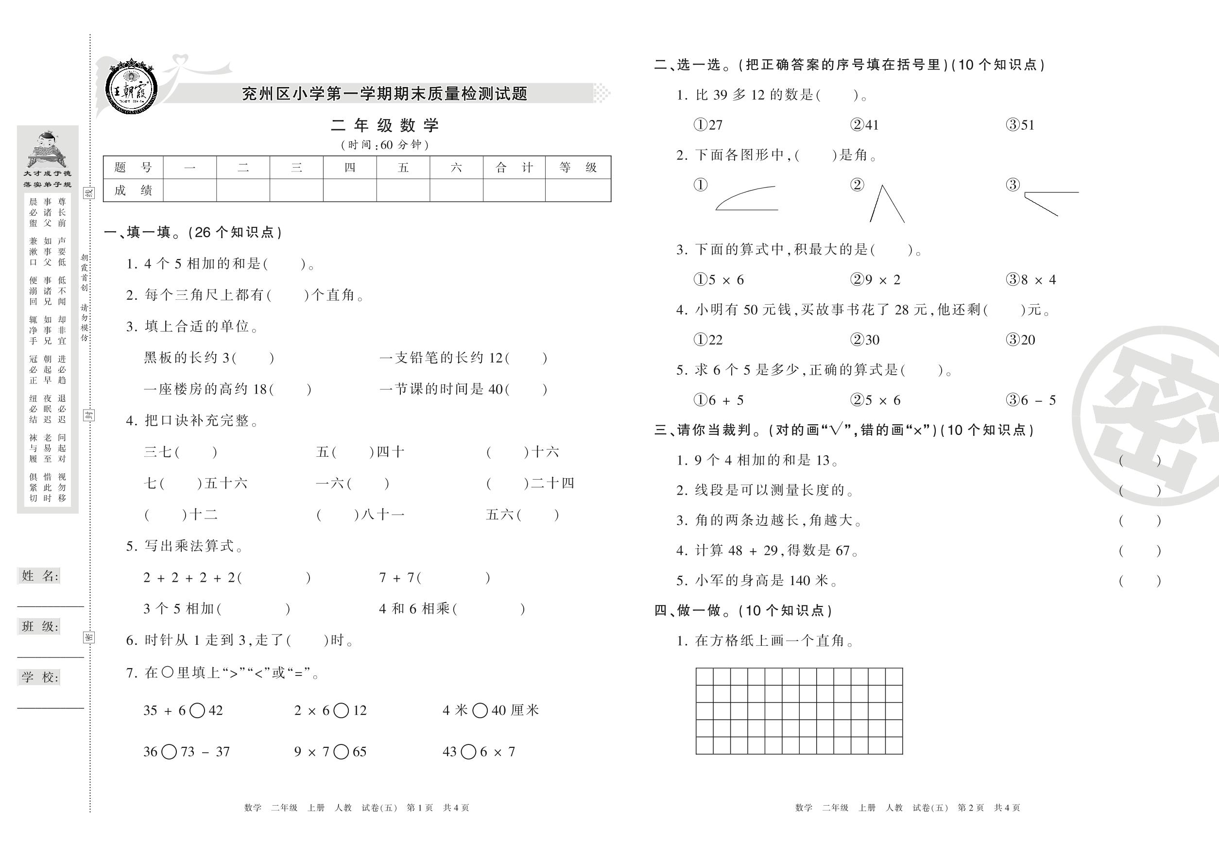 2016-2017学年第一学期济宁市兖州区二年级数学试卷(人教版)【5】