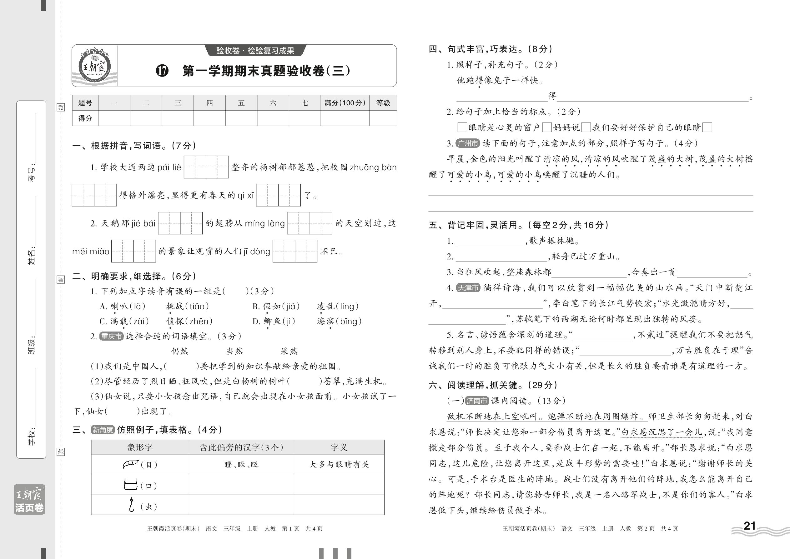 2023上册三年级语文人教版 17 第一学期期末真题验收卷(三)