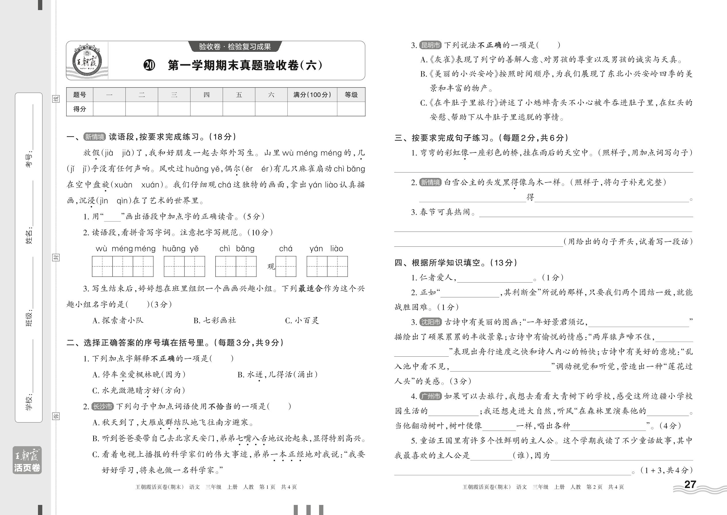 2023上册三年级语文人教版 20 第一学期期末真题验收卷(六)
