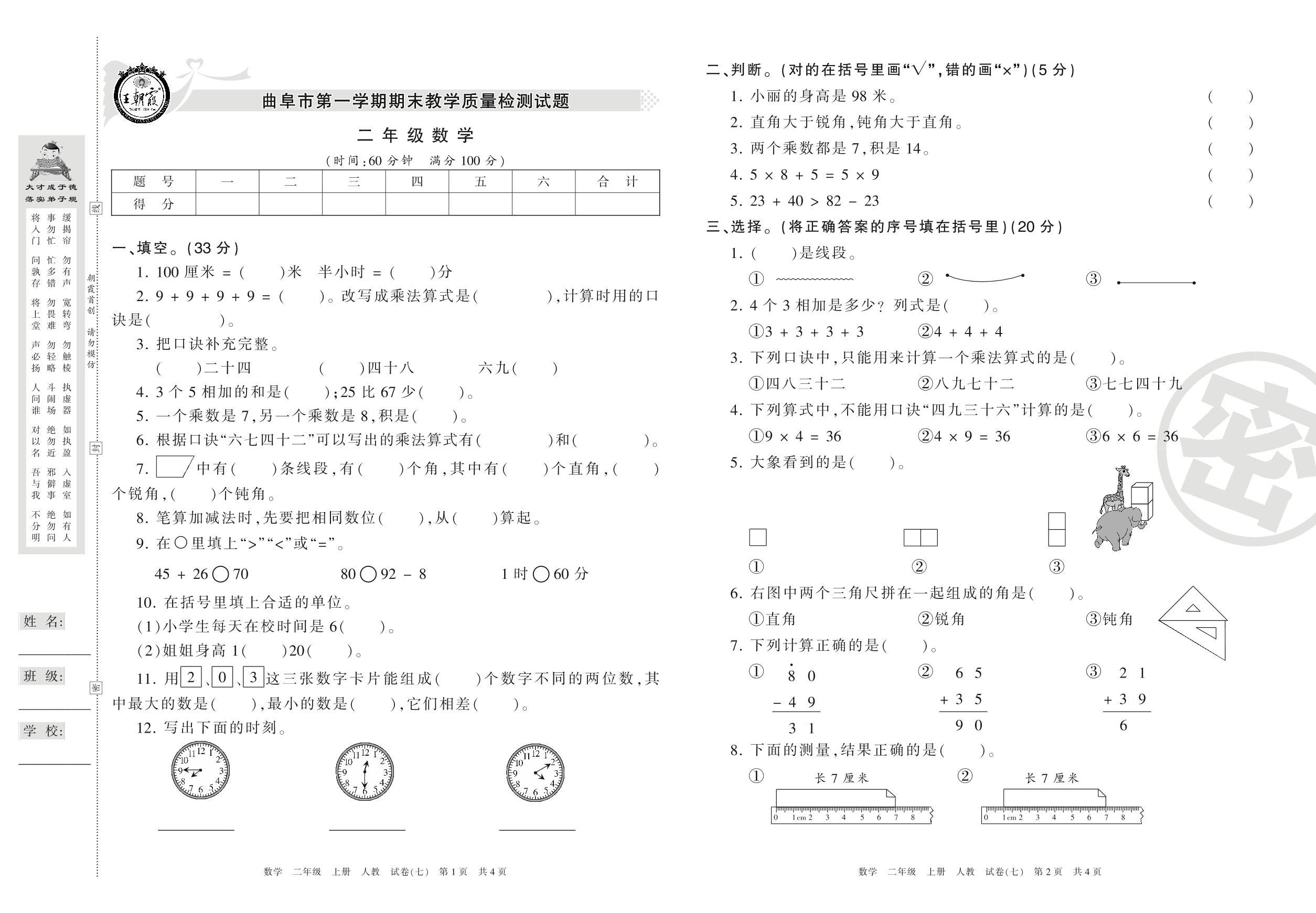 2016-2017学年第一学期曲阜市二年级数学试卷(人教版)【7】