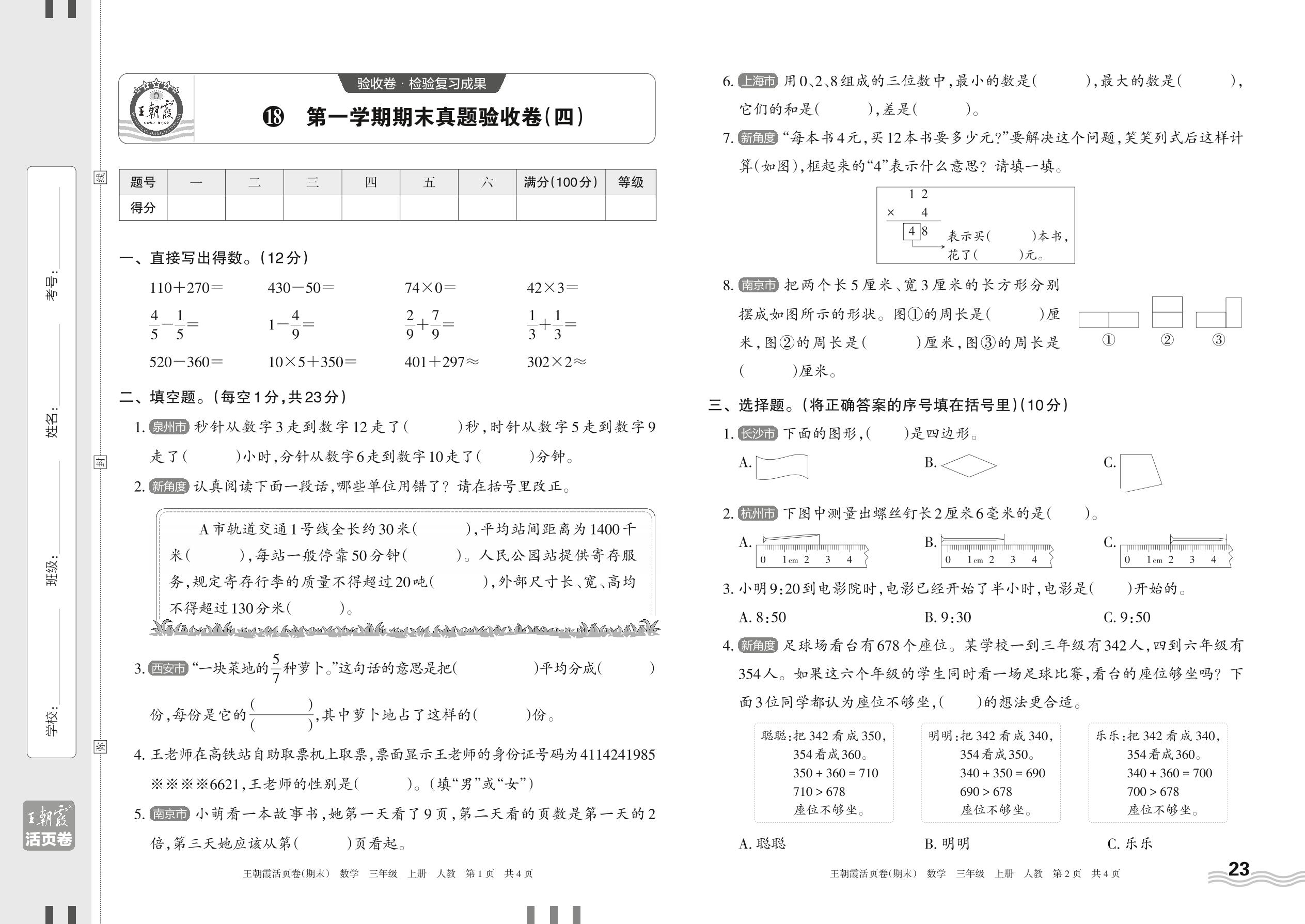 2023上册三年级数学人教版 18 第一学期期末真题验收卷(四)