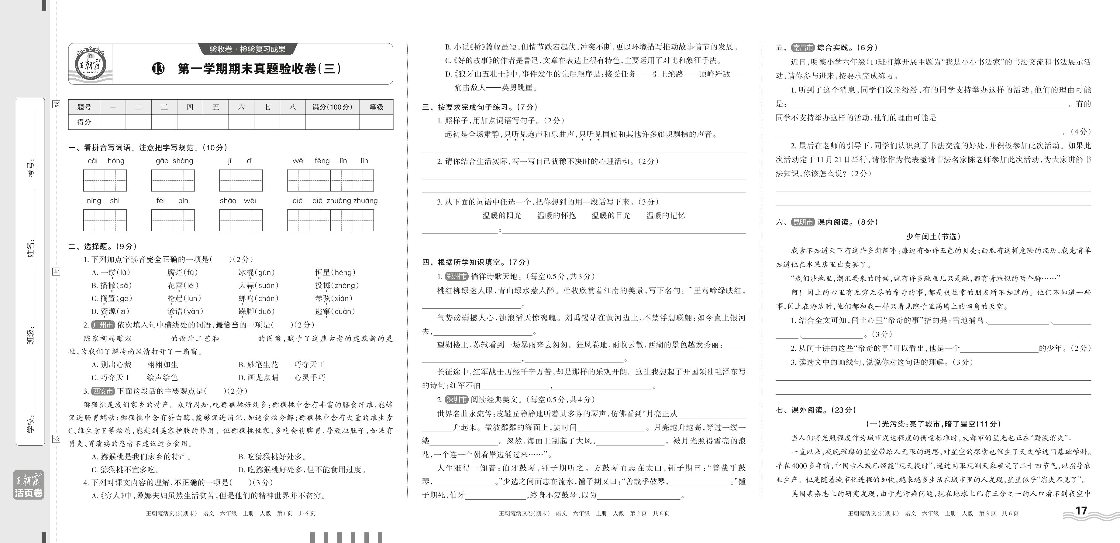 2023上册六年级语文人教版 13 第一学期期末真题验收卷(三)