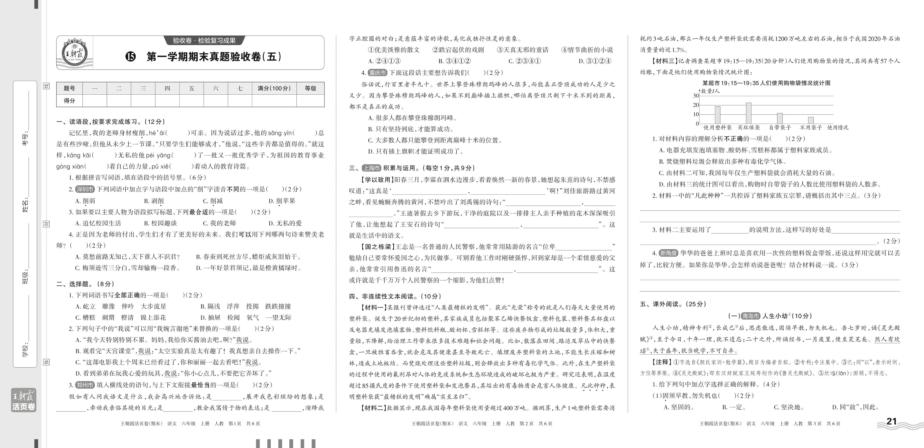 2023上册六年级语文人教版 15 第一学期期末真题验收卷(五)