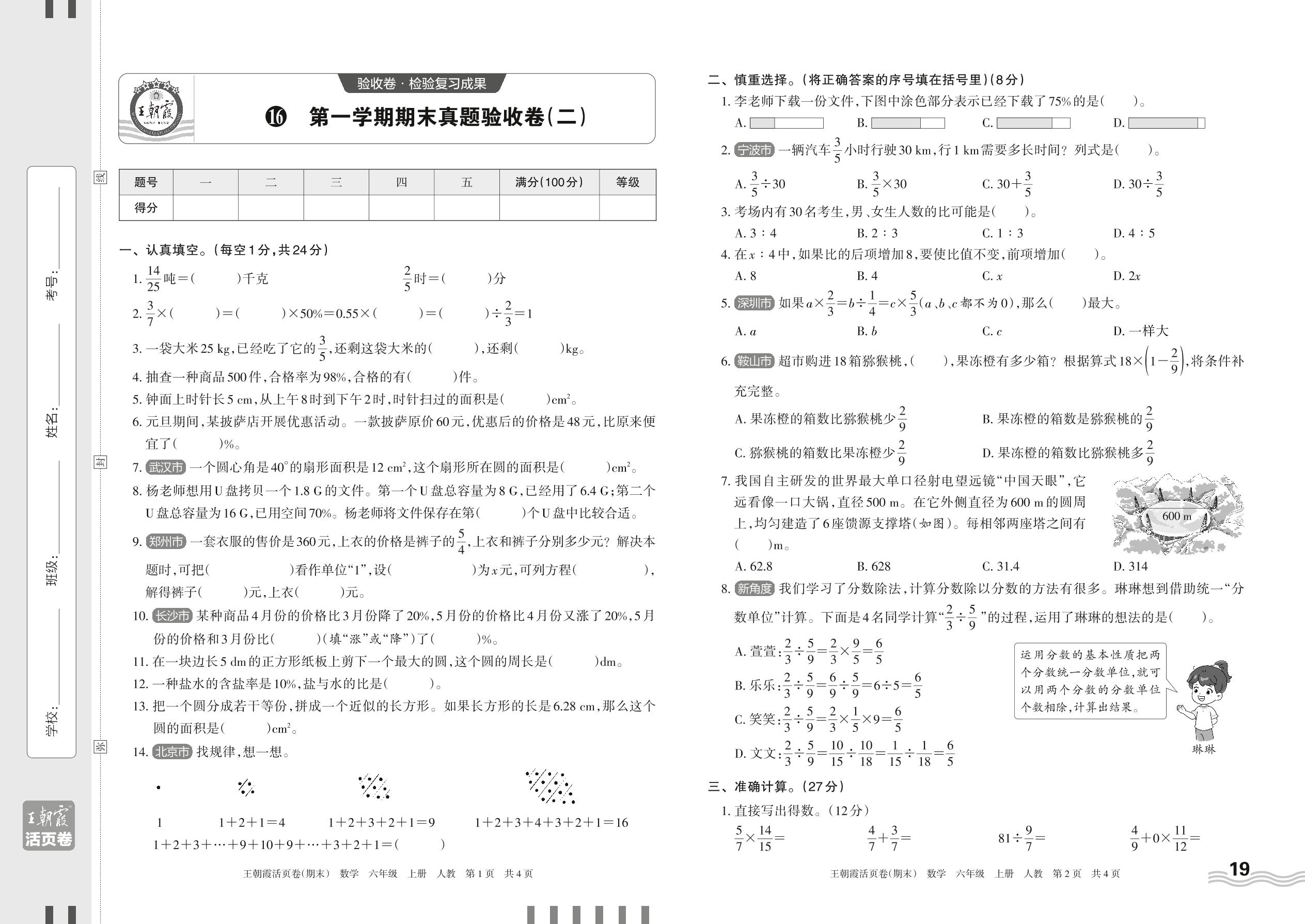 2023上册六年级数学人教版 16 第一学期期末真题验收卷(二)