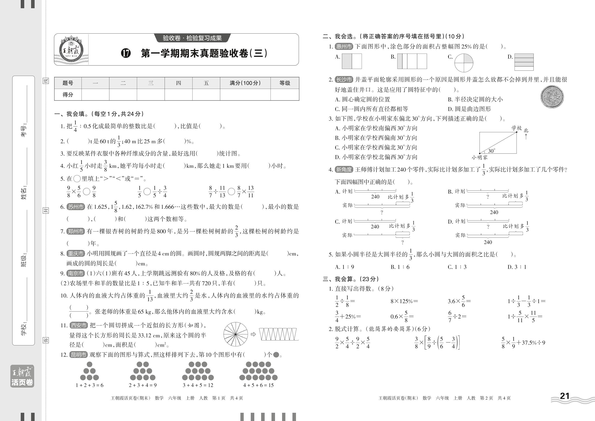 2023上册六年级数学人教版 17 第一学期期末真题验收卷(三)