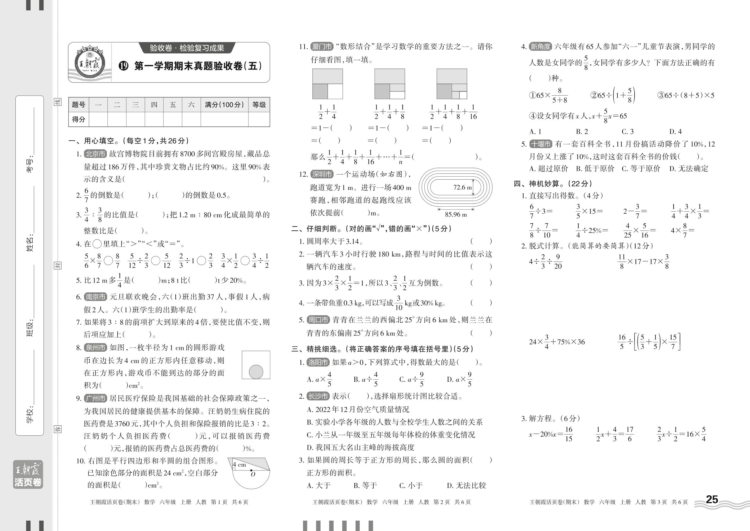 2023上册六年级数学人教版 19 第一学期期末真题验收卷(五)