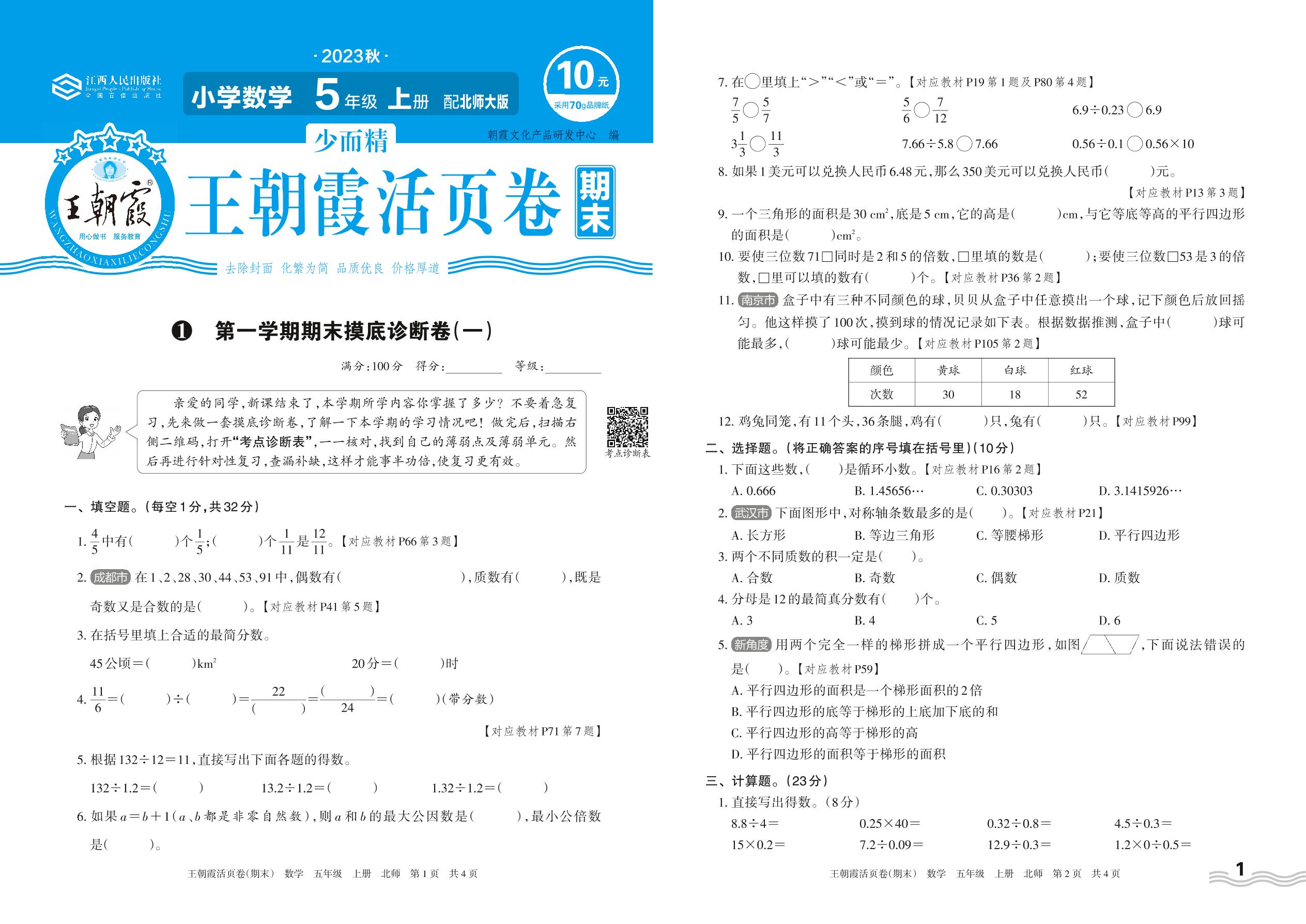 2023上册五年级数学北师版 1 第一学期期末摸底诊断卷(一)