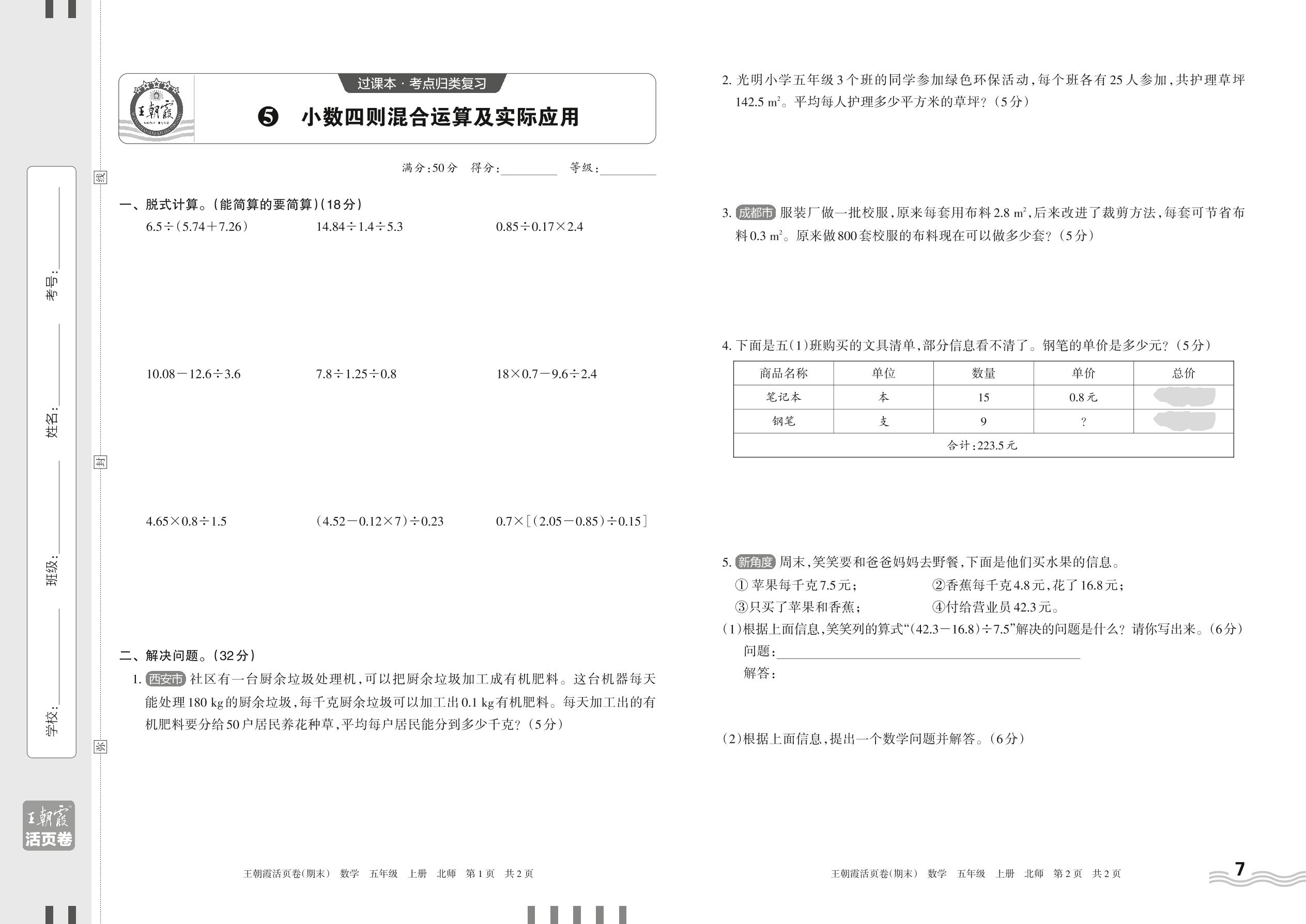 2023上册五年级数学北师版 5 小数四则混合运算及实际应用