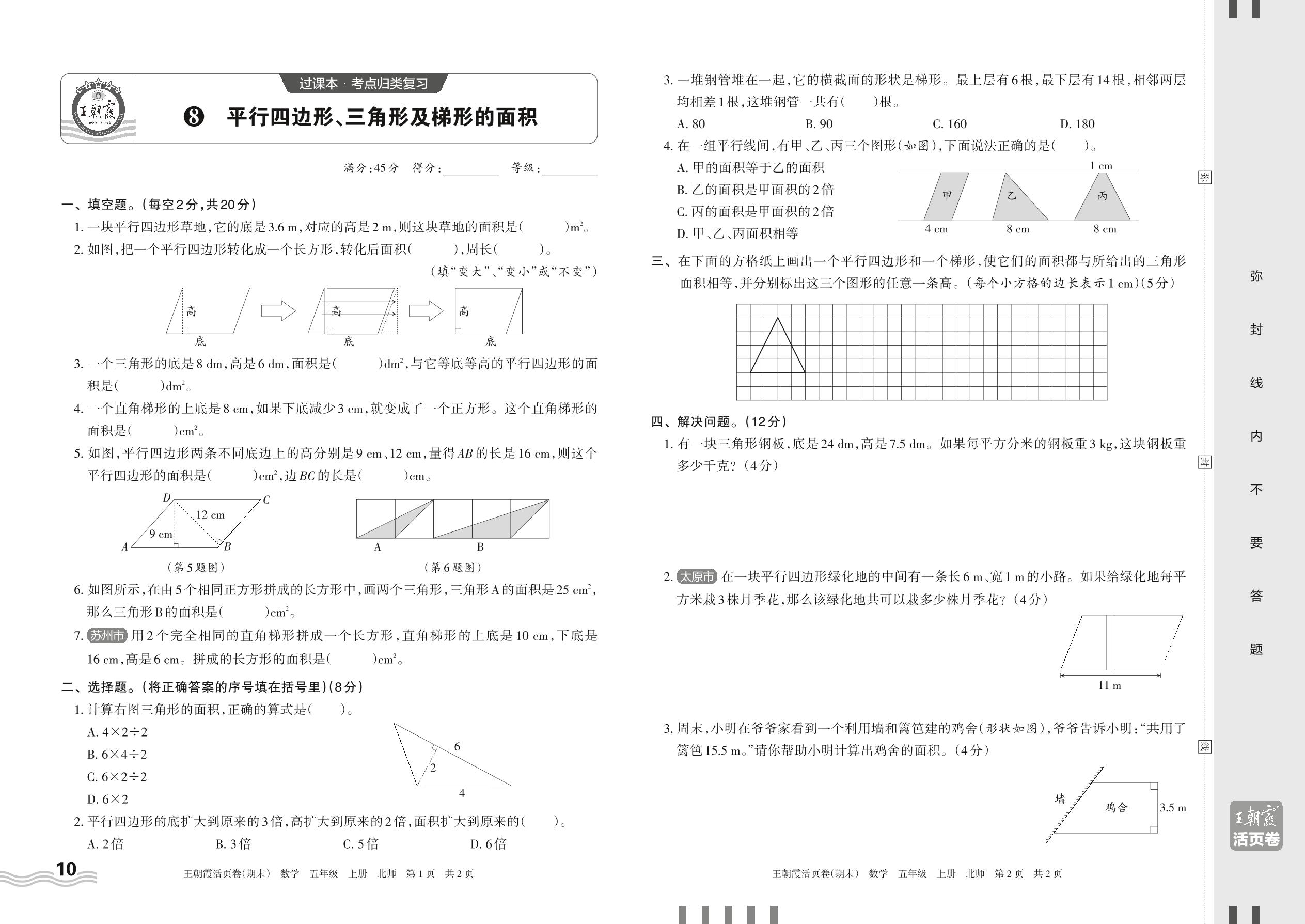 2023上册五年级数学北师版 8 平行四边形、三角形及梯形的面积