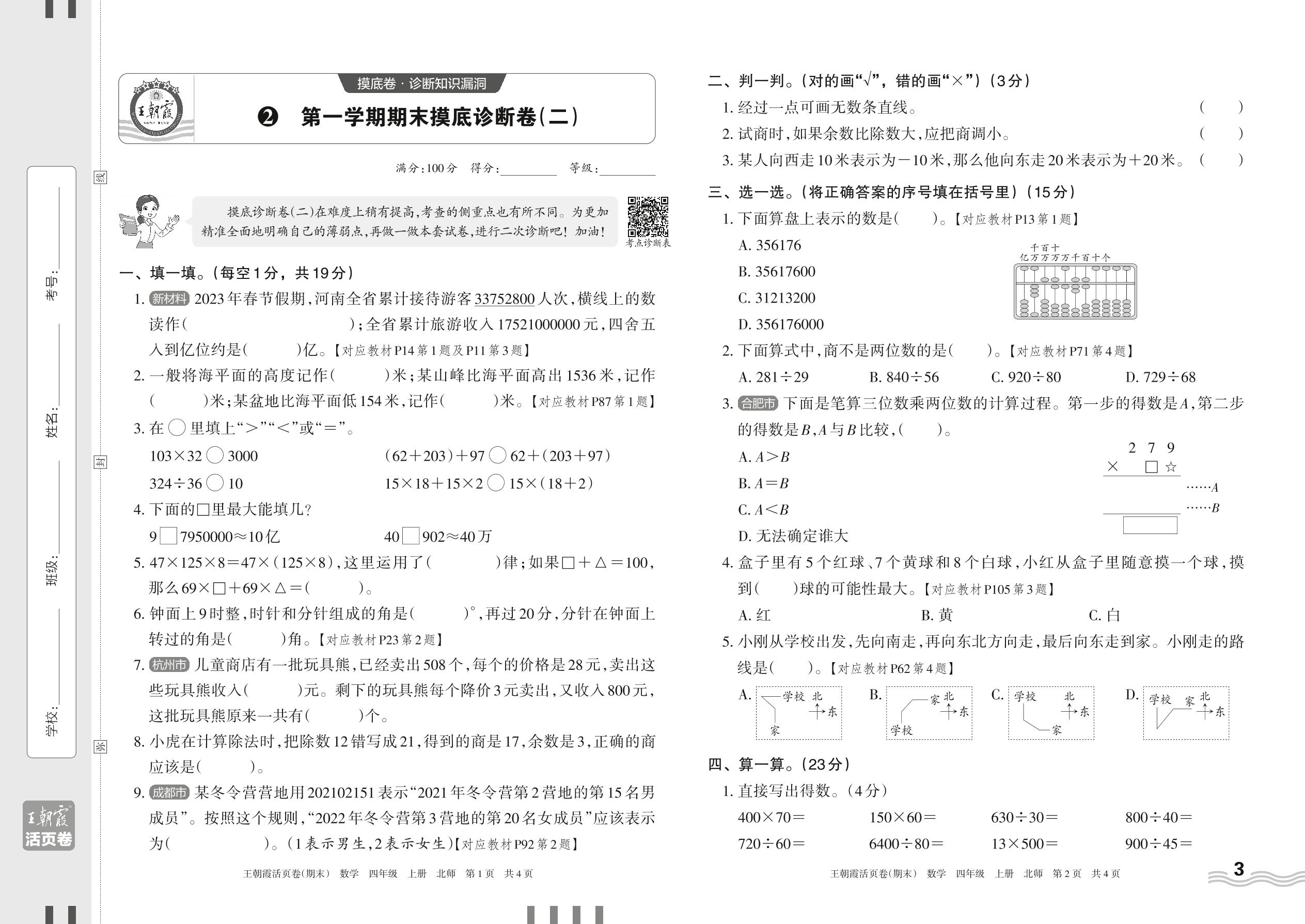 2023上册四年级数学北师版 2 第一学期期末摸底诊断卷(二)