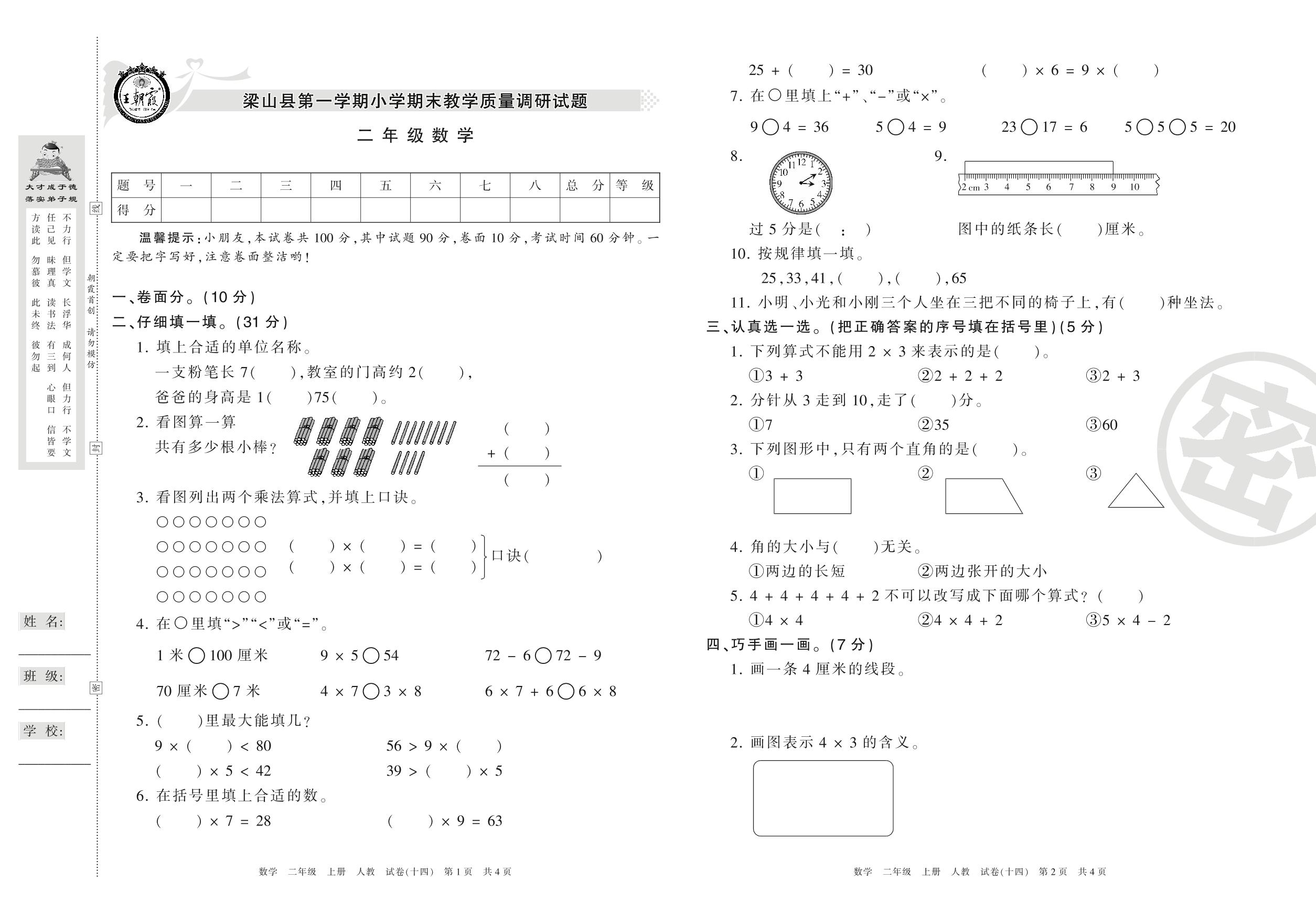2016-2017学年第一学期济宁市梁山县二年级数学试卷(人教版)【14】