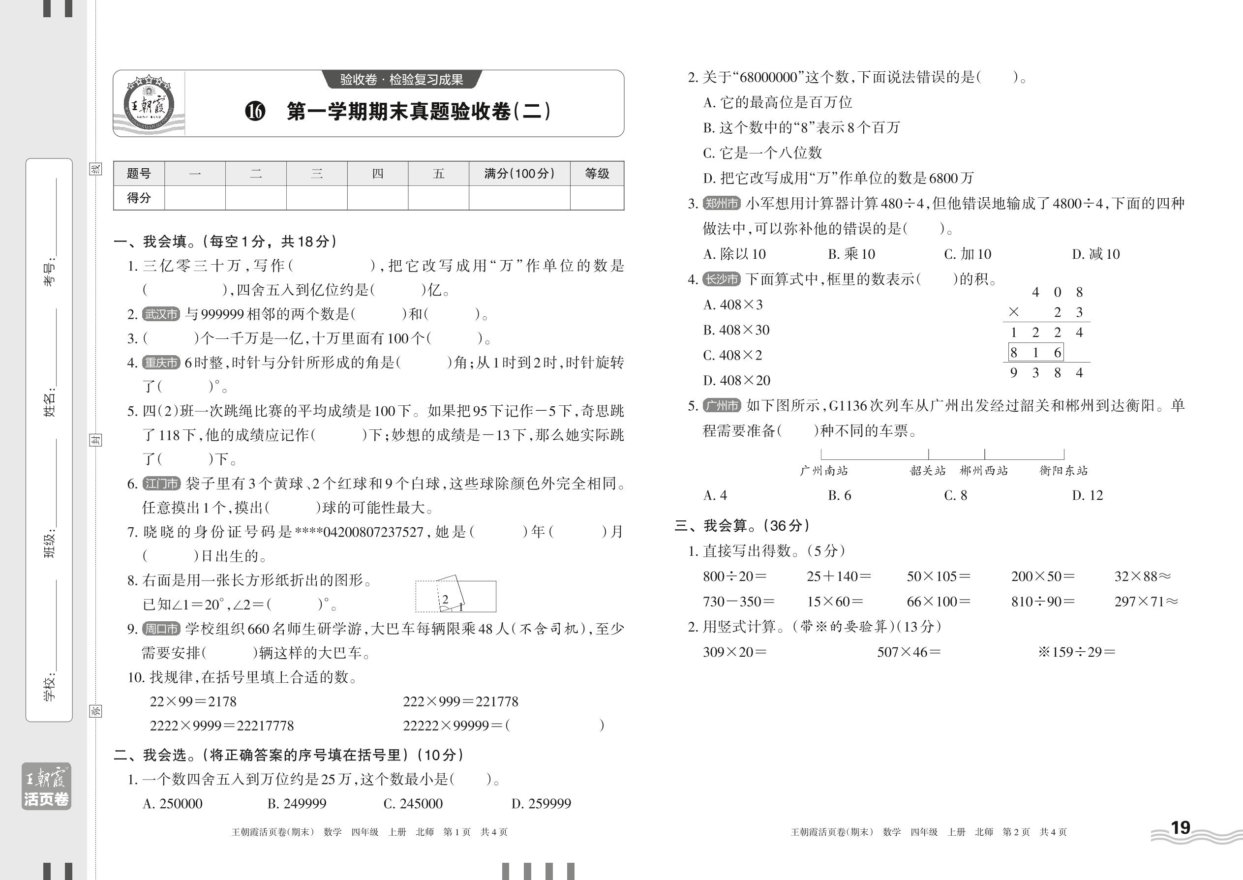 2023上册四年级数学北师版 16 第一学期期末真题验收卷(二)