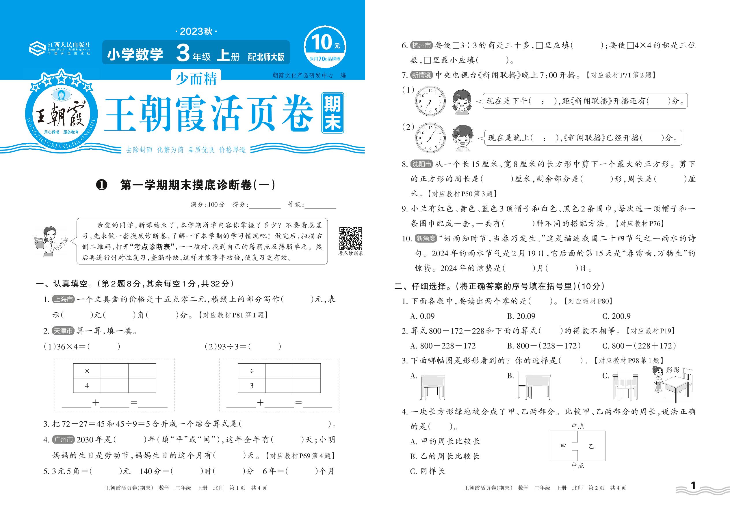 2023上册三年级数学北师版 1 第一学期期末摸底诊断卷(一)