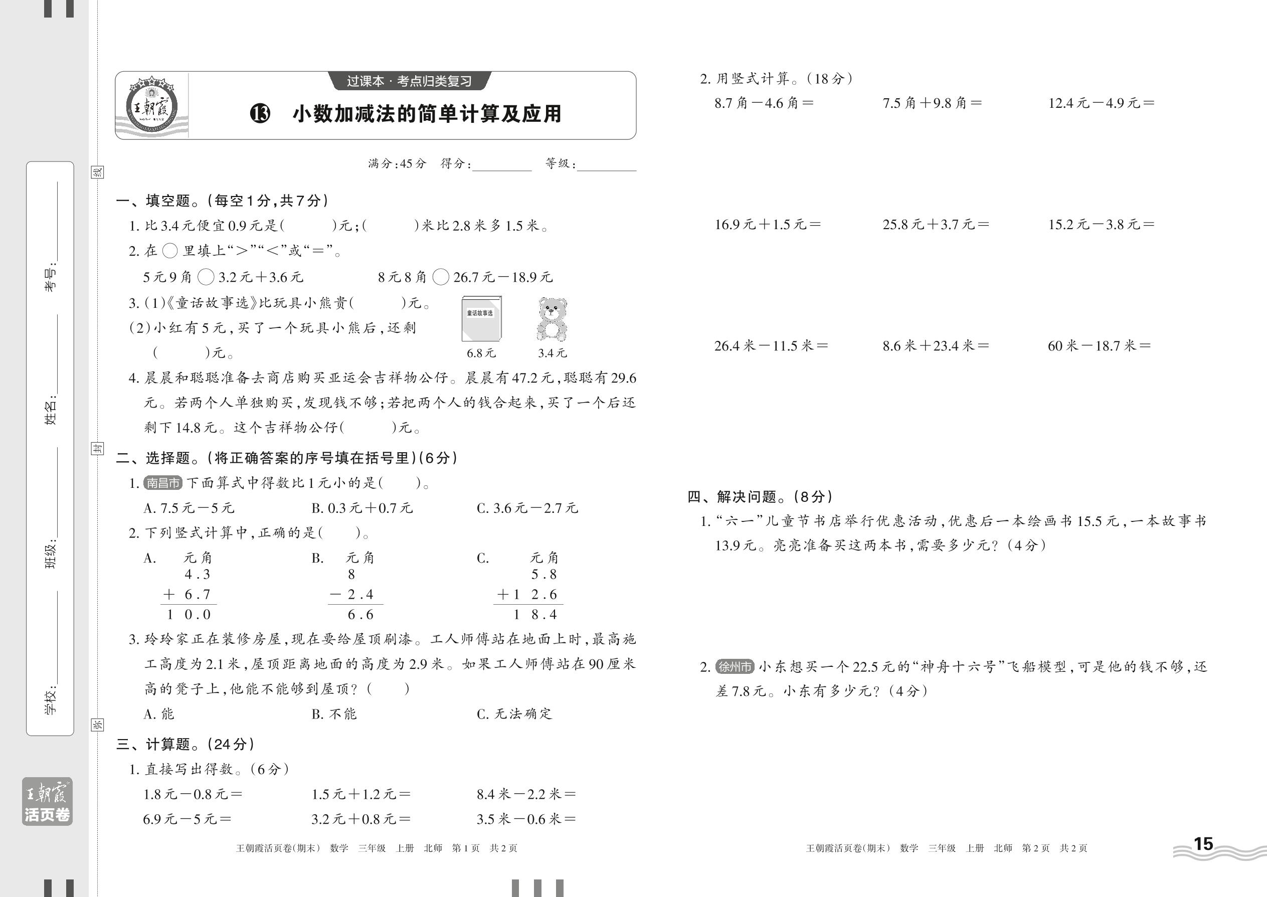 2023上册三年级数学北师版 13 小数加减法的简单计算及应用