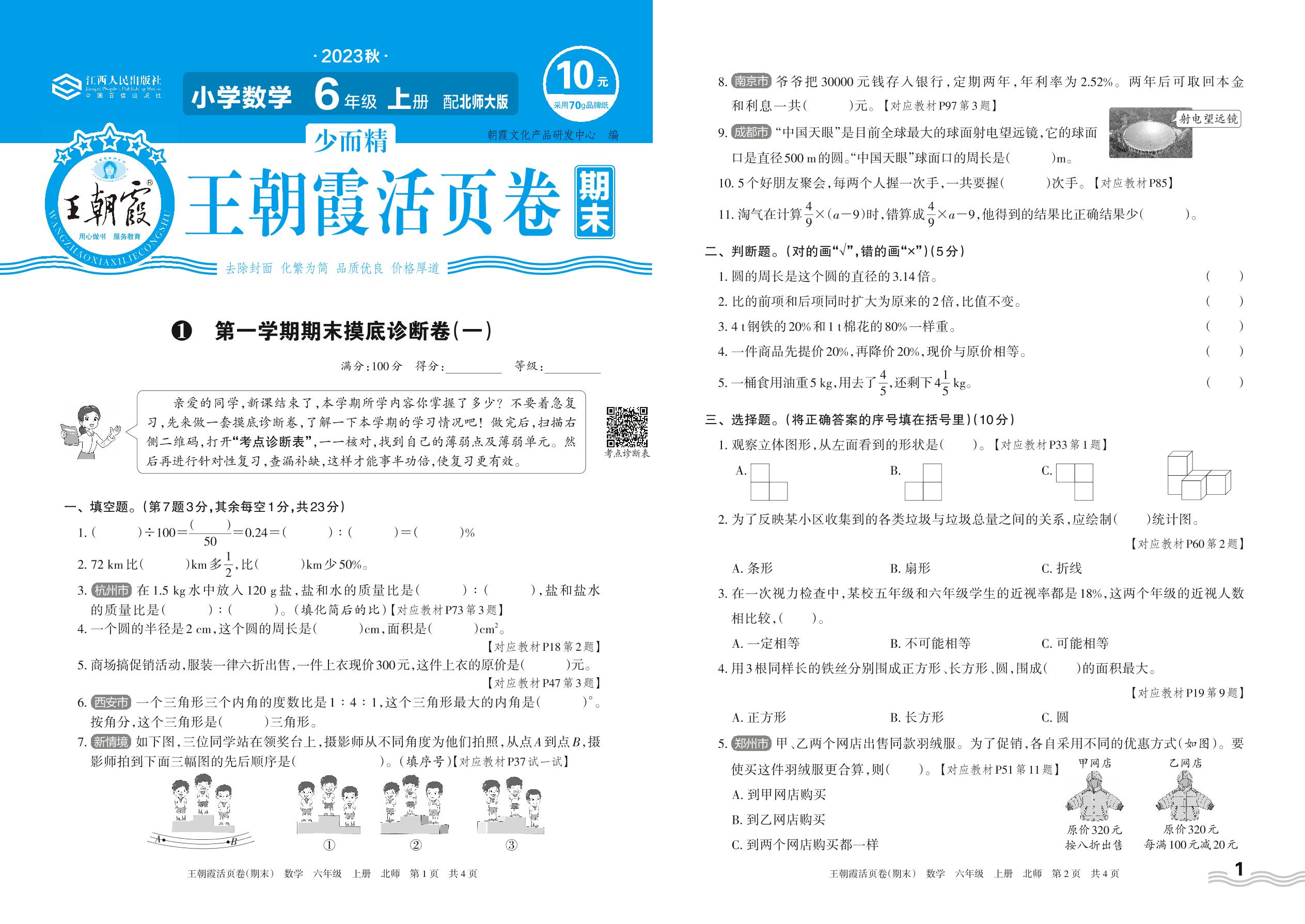 2023上册六年级数学北师版 1 第一学期期末摸底诊断卷(一)