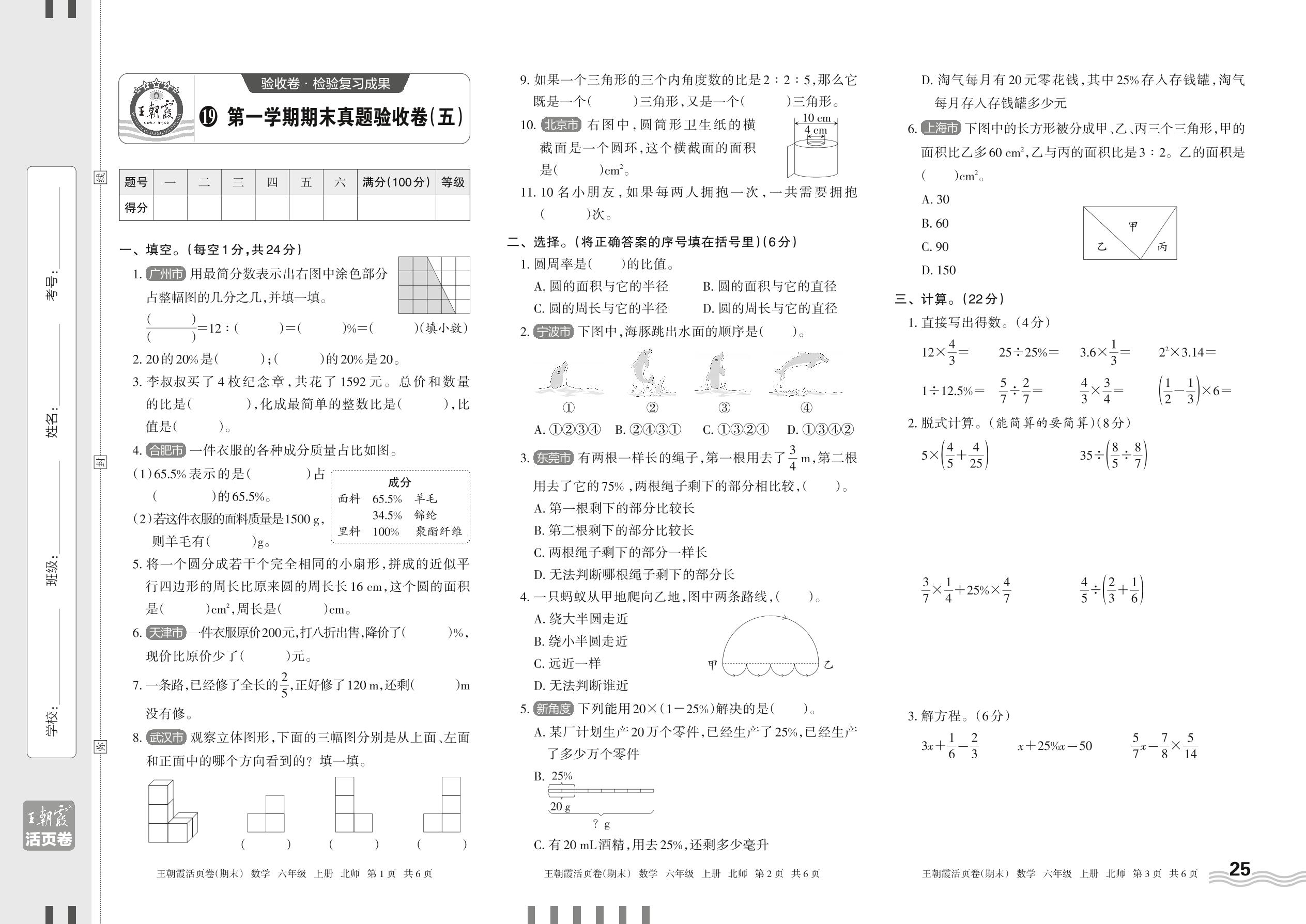 2023上册六年级数学北师版 19 第一学期期末真题验收卷(五)