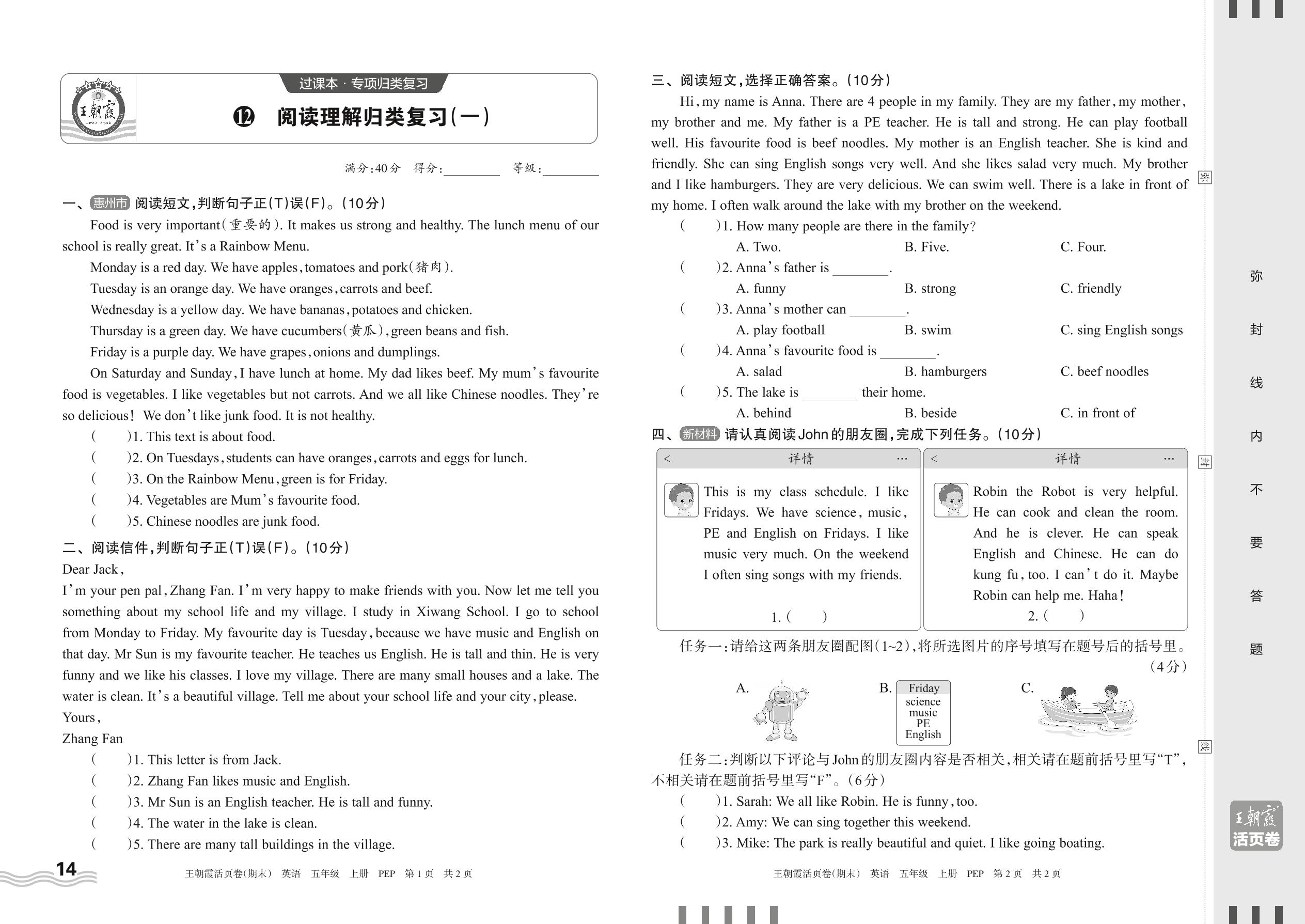 2023上册五年级英语人教PEP版 12 阅读理解归类复习(一)