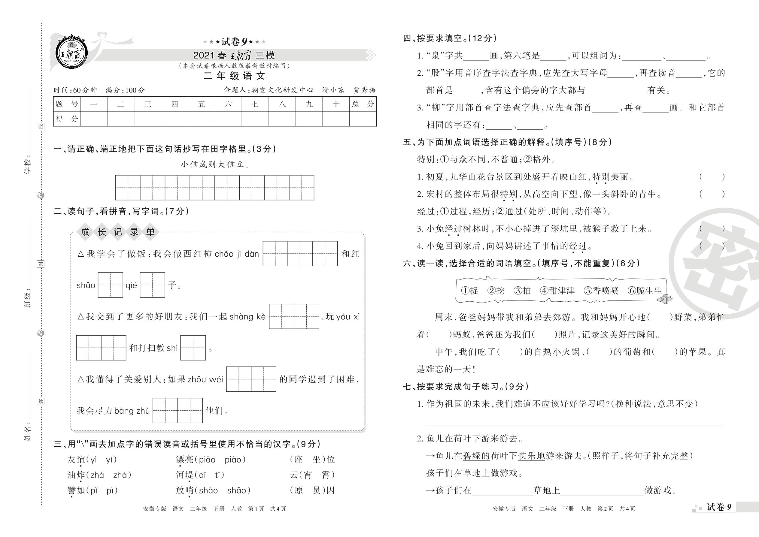 王朝霞期末模拟卷二年级下册语文(人教版)_R21080163553【9】