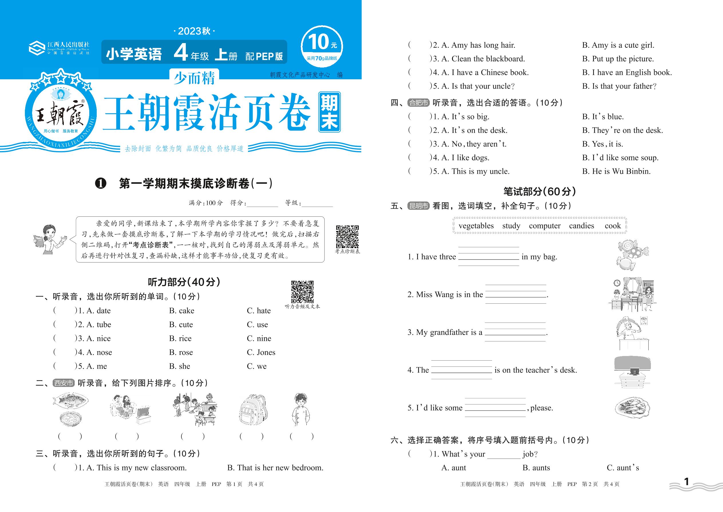 2023上册四年级英语人教PEP版 1 第一学期期末摸底诊断卷(一)