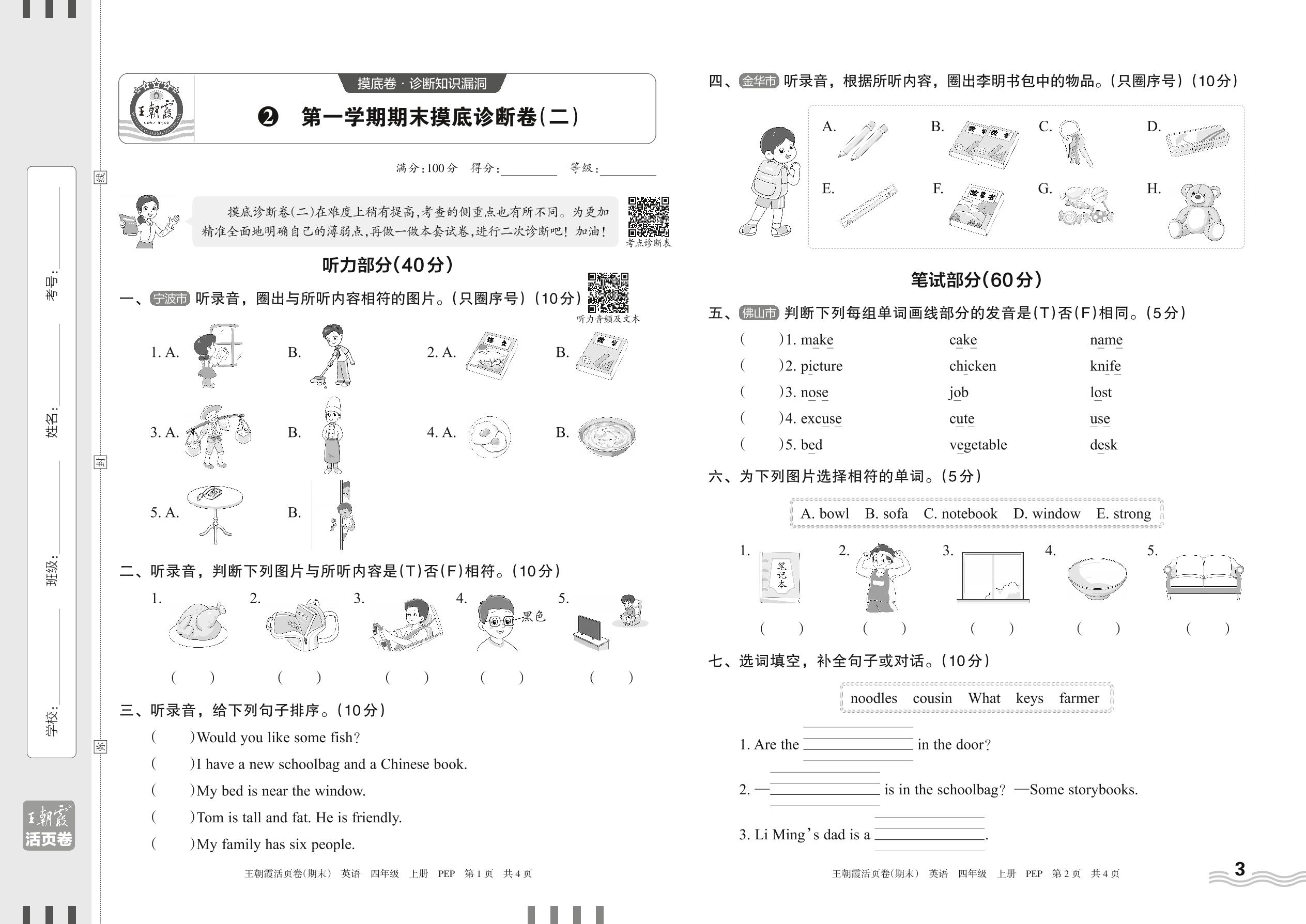 2023上册四年级英语人教PEP版 2 第一学期期末摸底诊断卷(二)