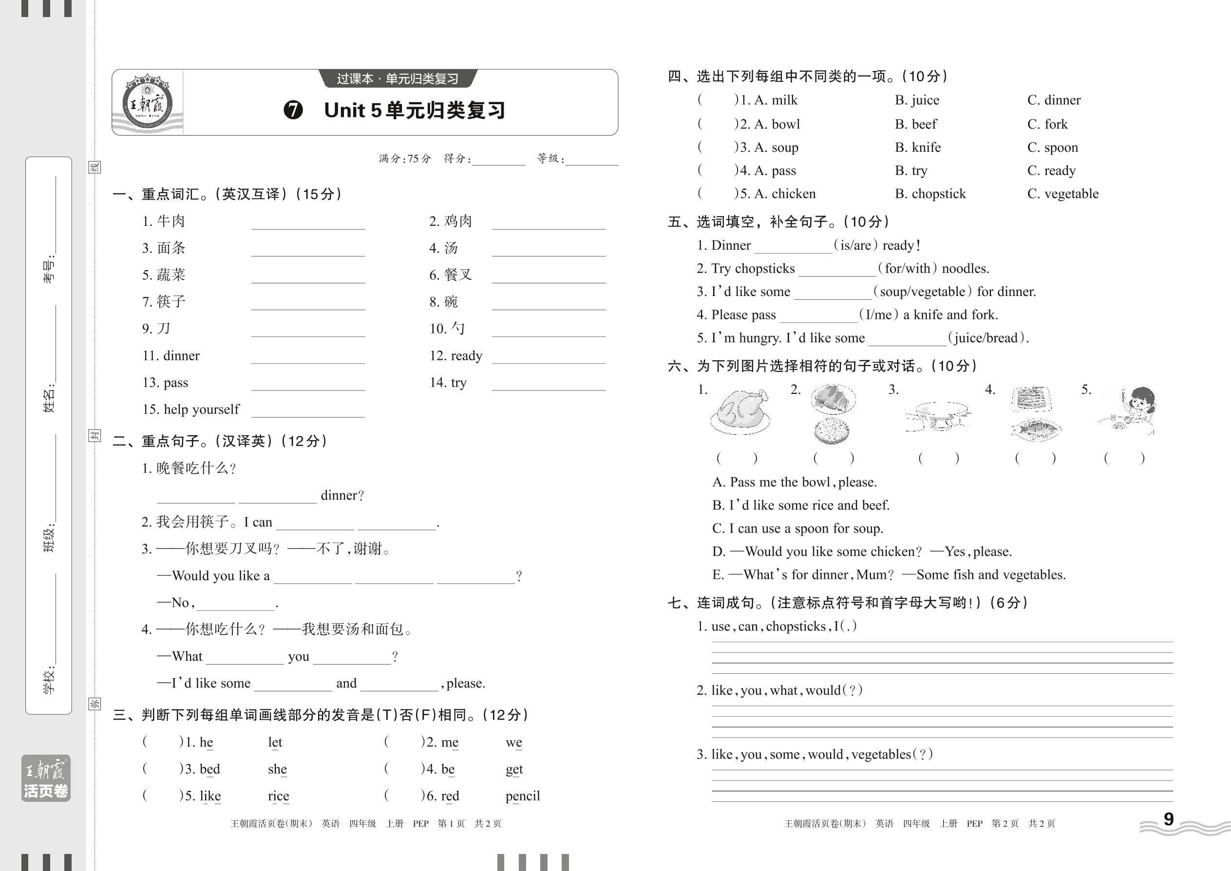 2023上册四年级英语人教PEP版 7 Unit 5单元归类复习