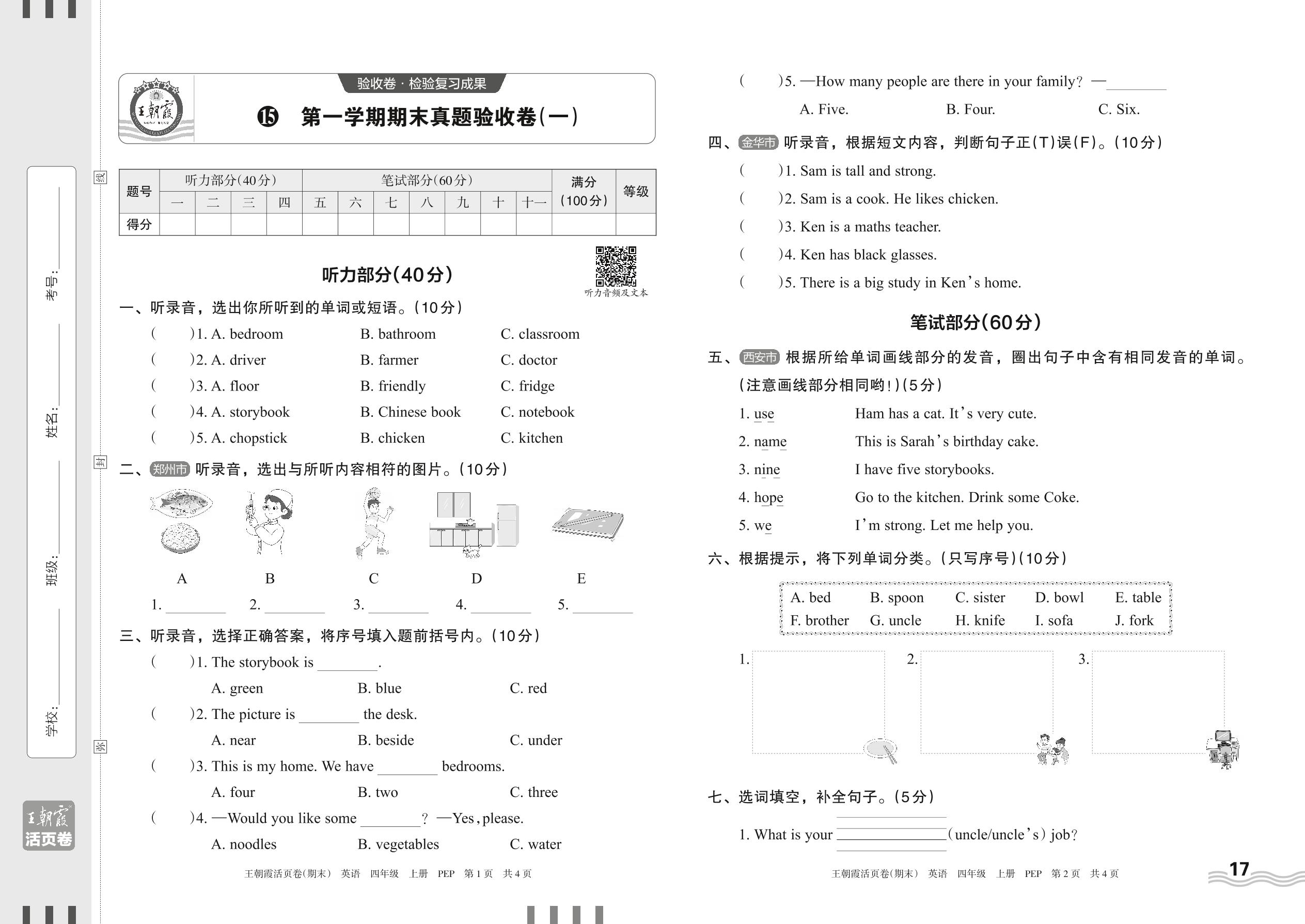 四年级英语人教PEP版(三起始)上册期末卷