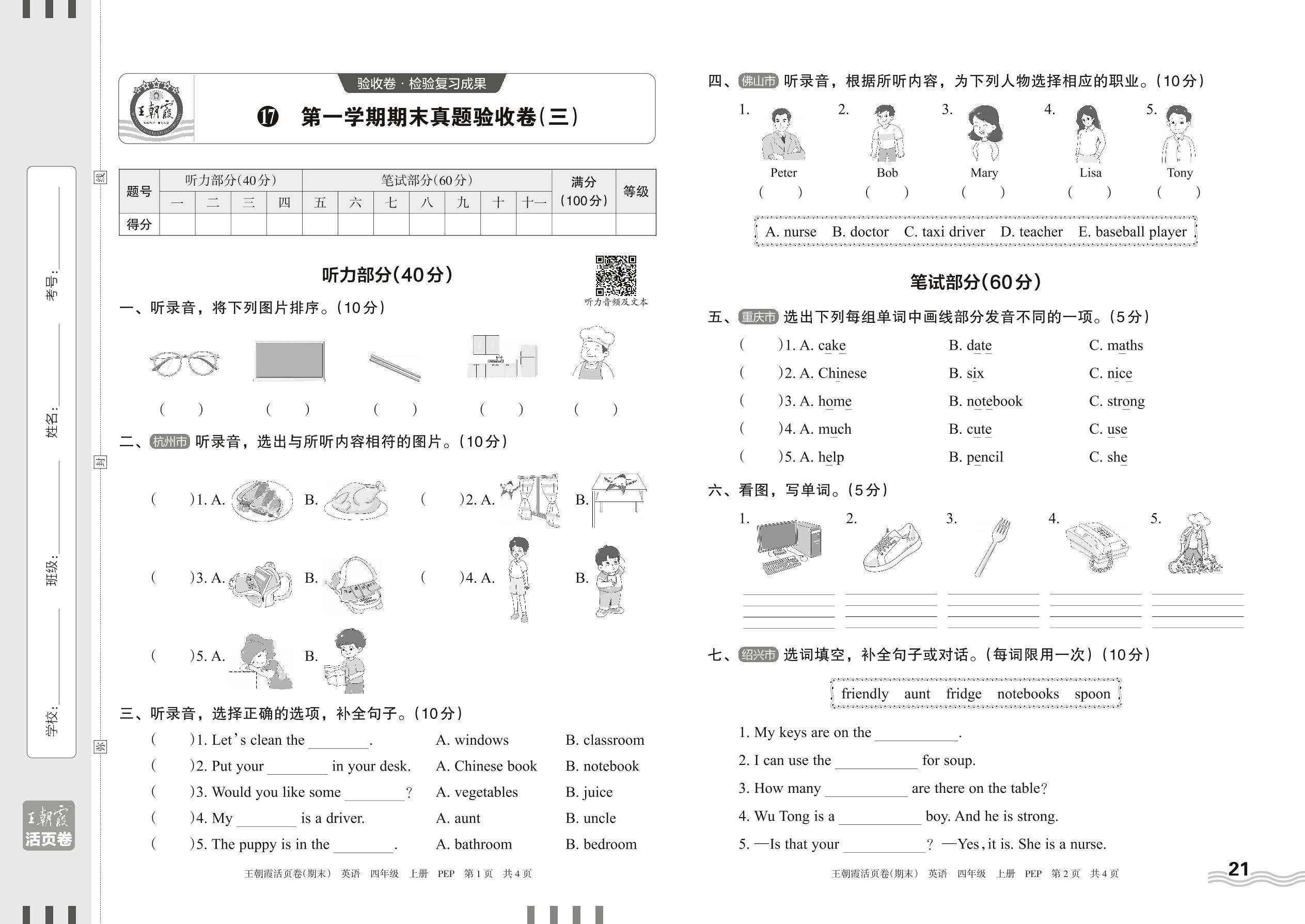 2023上册四年级英语人教PEP版 17 第一学期期末真题验收卷(三)