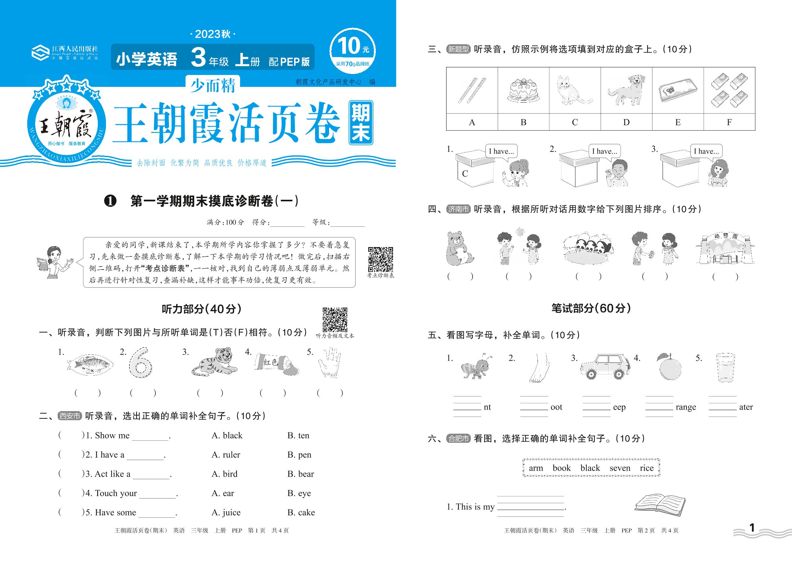 2023上册三年级英语人教PEP版 1 第一学期期末摸底诊断卷(一)