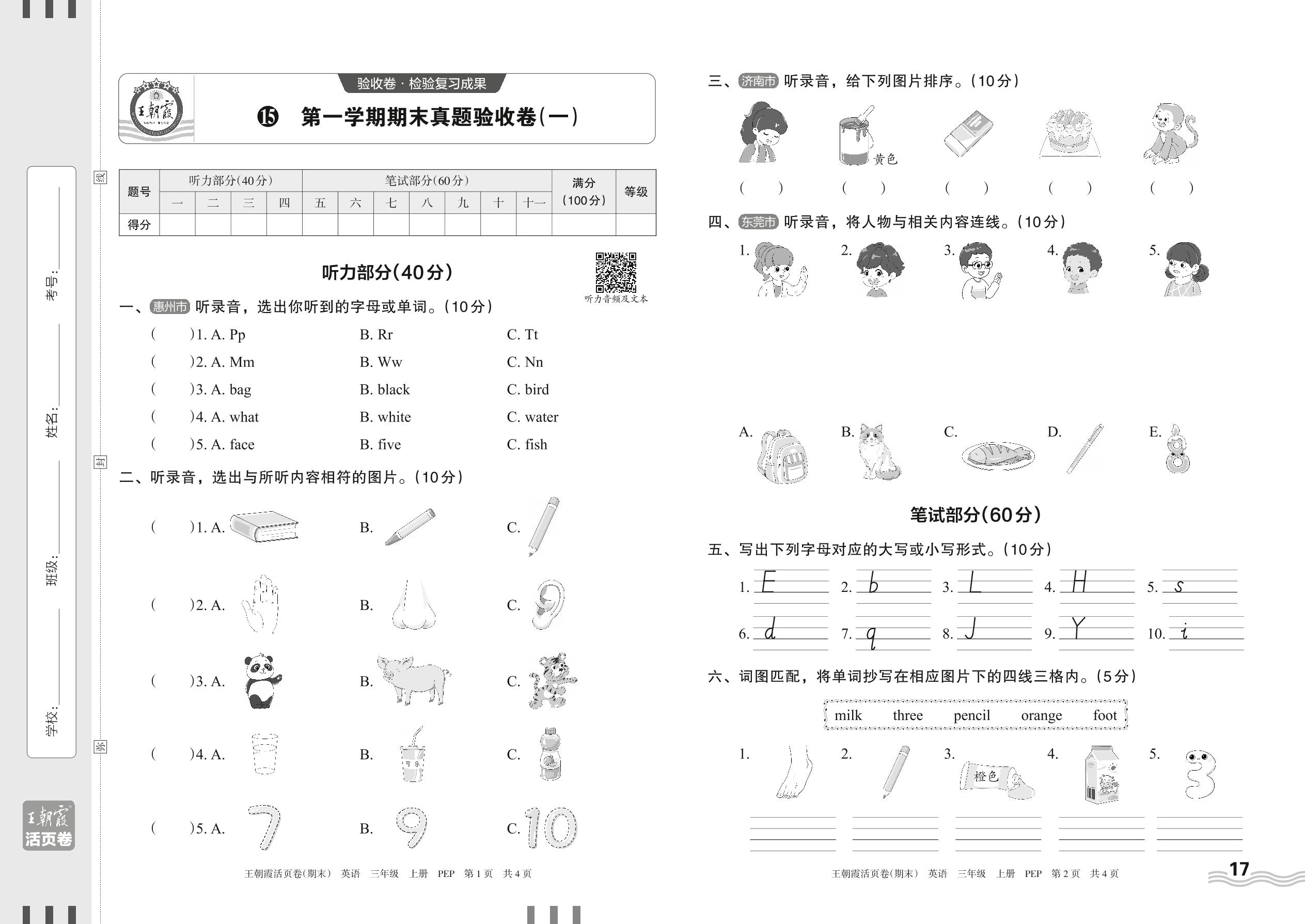 三年级英语人教PEP版(三起始)上册期末卷