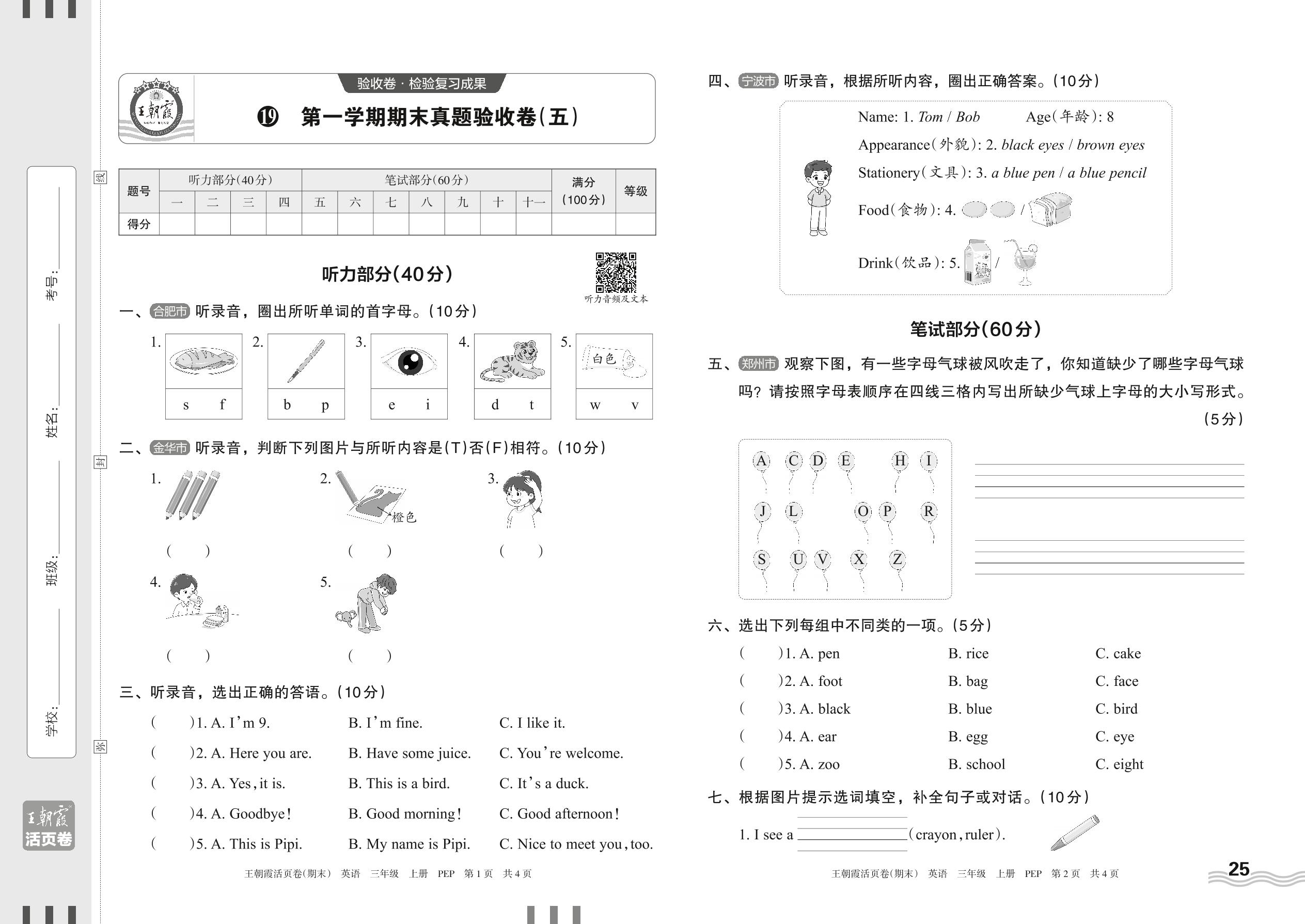 2023上册三年级英语人教PEP版 19 第一学期期末真题验收卷(五)