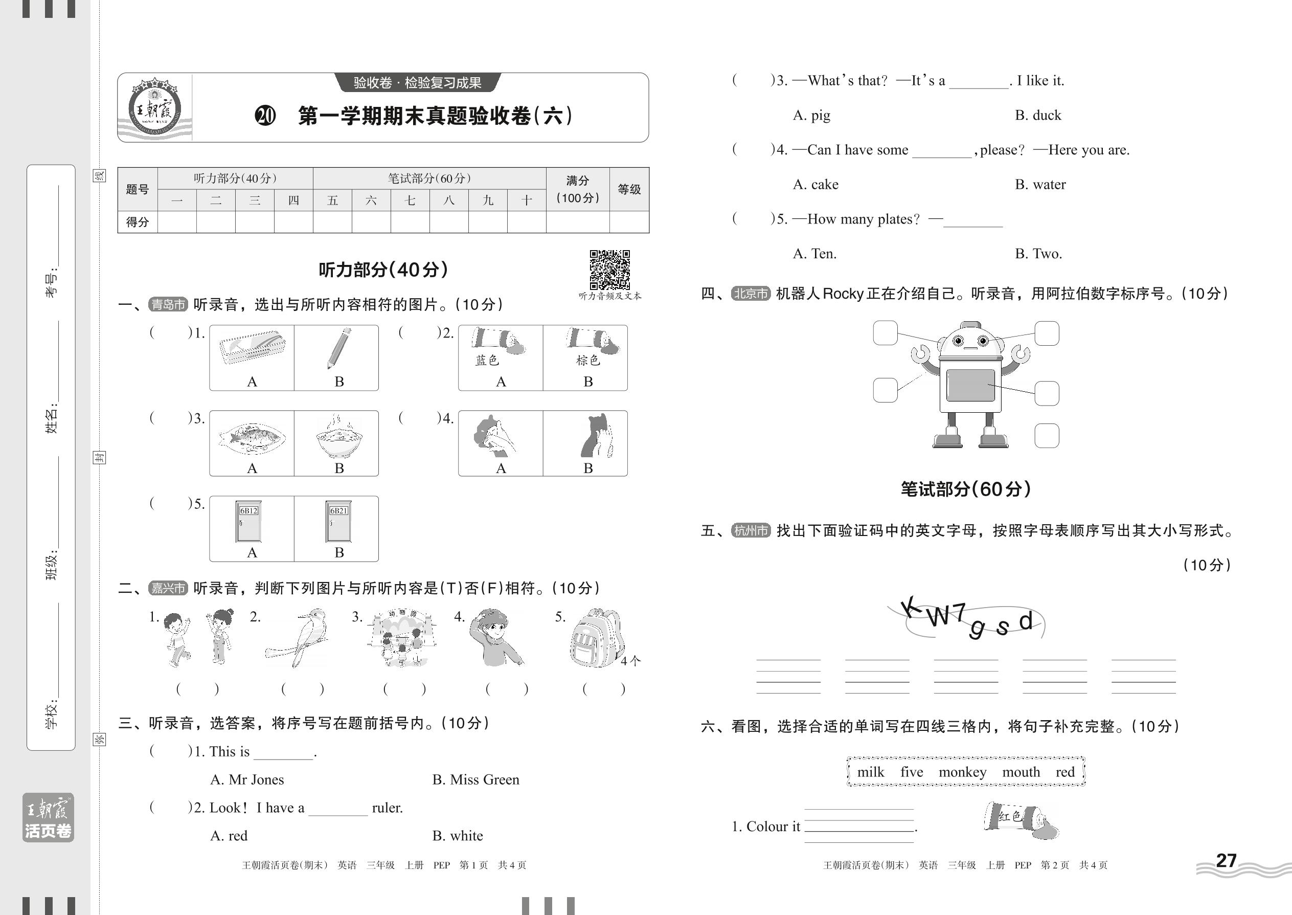 三年级英语人教PEP版(三起始)上册期末卷