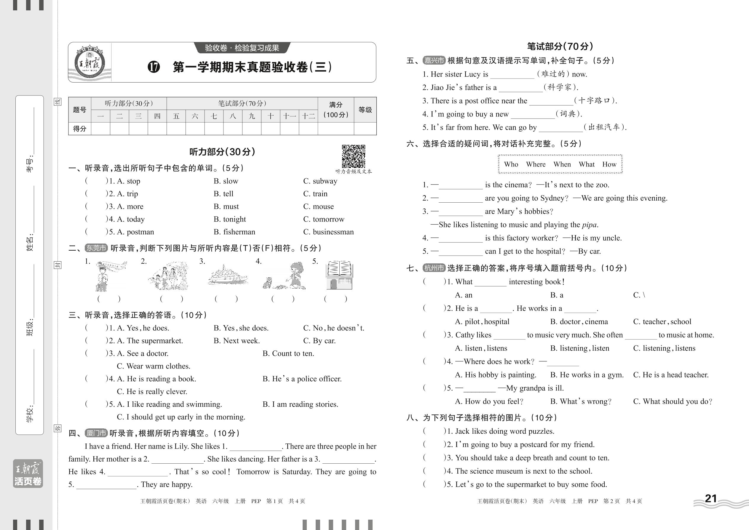 六年级英语人教PEP版(三起始)上册期末卷