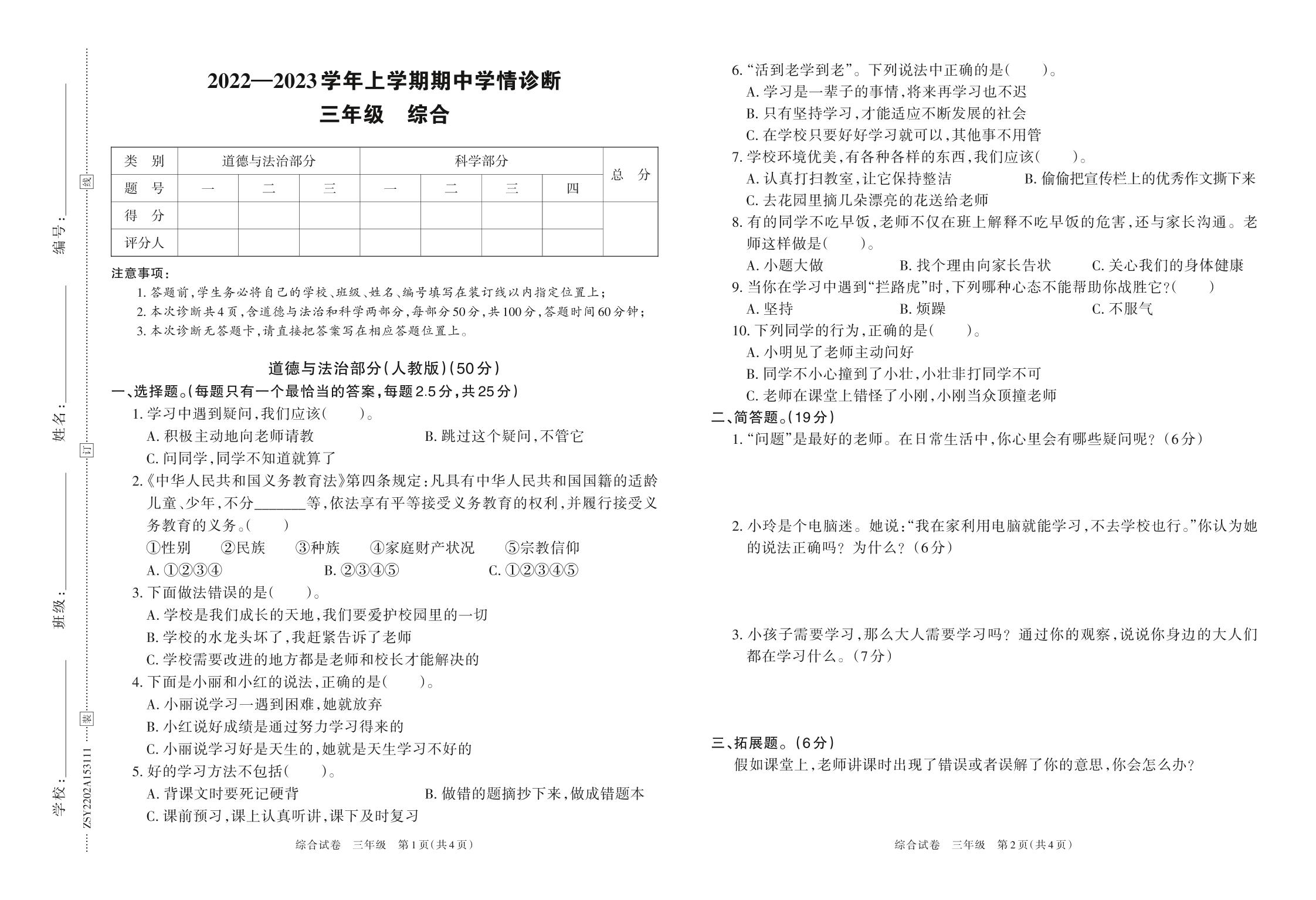 河南省洛阳市栾川县10余所乡镇小学2022-2023学年上学期期中学情诊断卷三年级科学(大象版)