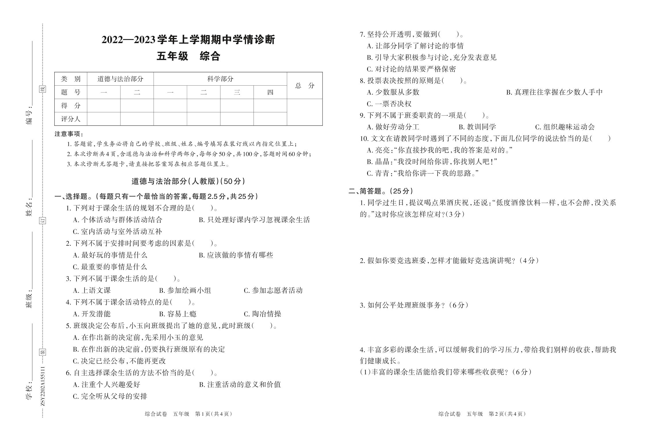 五年级道德与法治人教版上册期中卷