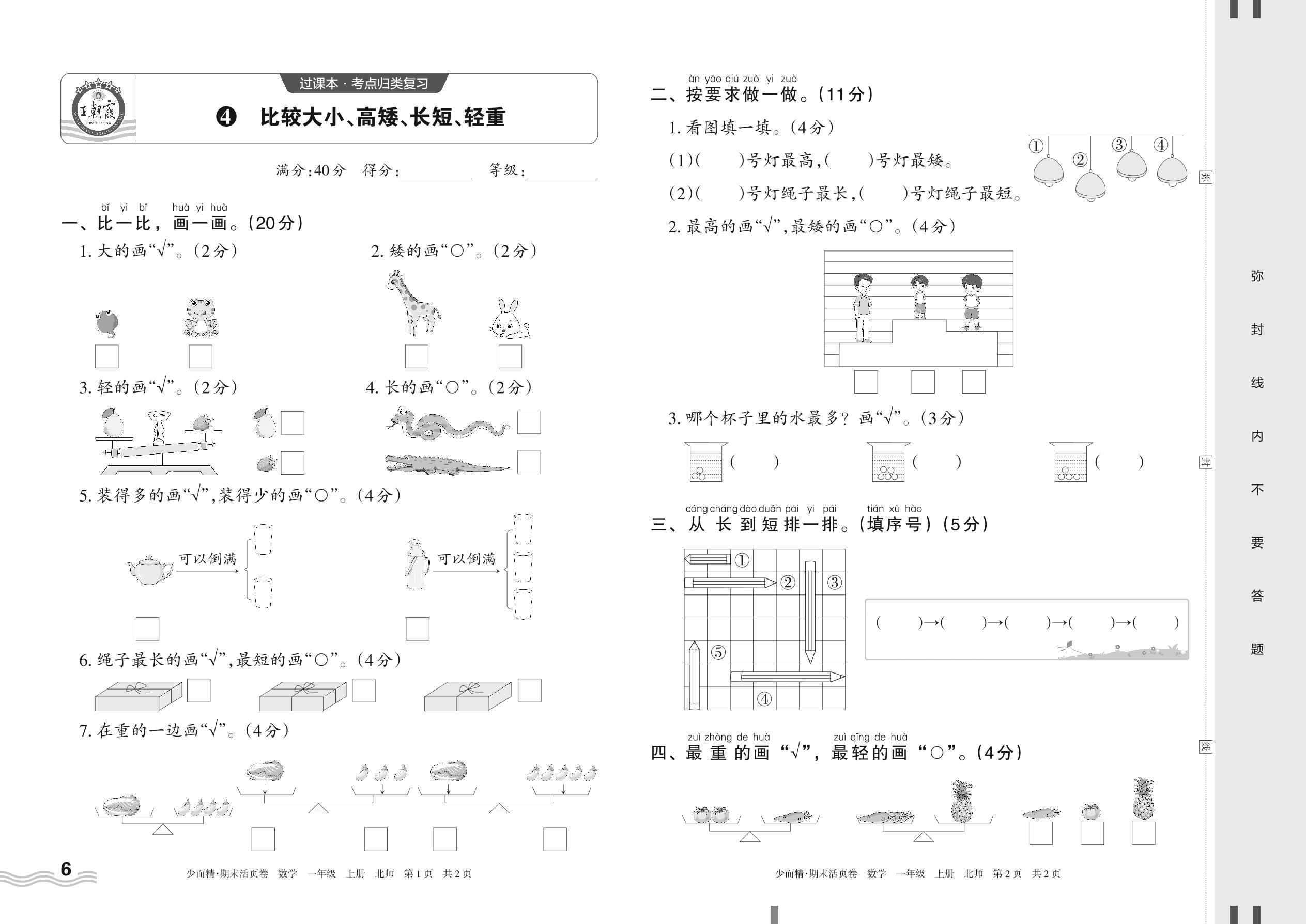 2023上册一年级数学北师版 4 比较大小、高矮、长短、轻重