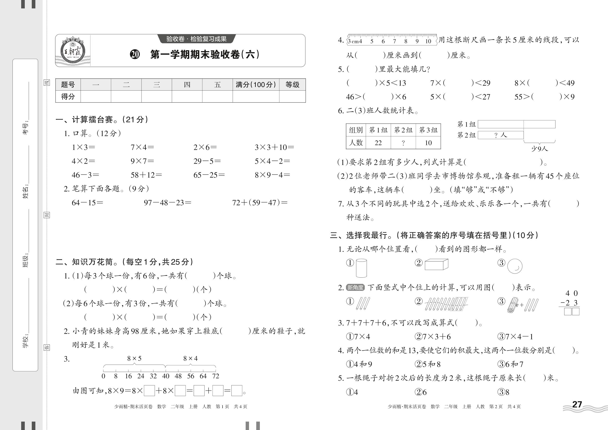 2023上册二年级数学人教版 20 第一学期期末验收卷(六)