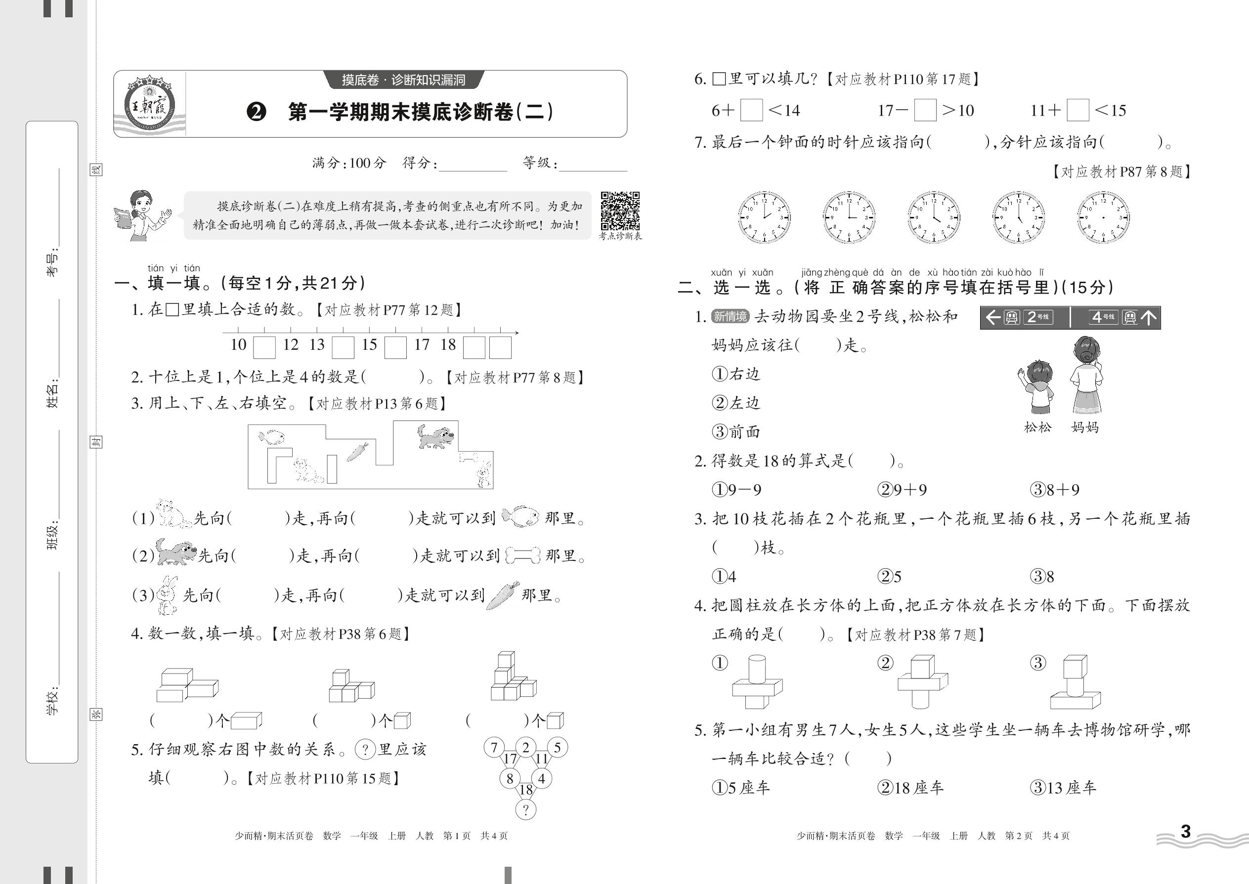 2023上册一年级数学人教版 2 第一学期期末摸底诊断卷(二)