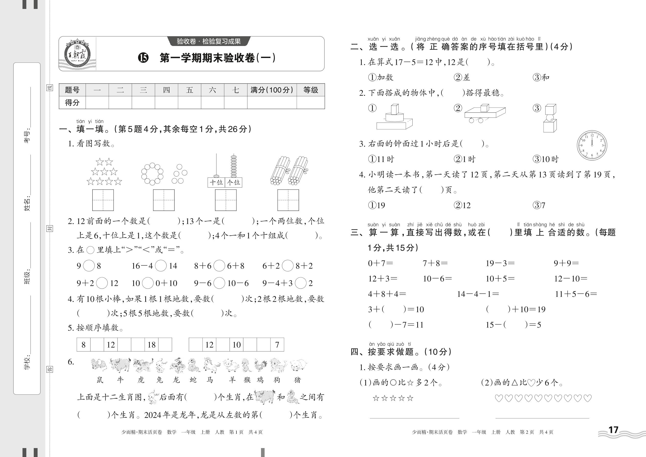 2023上册一年级数学人教版 15 第一学期期末验收卷(一)